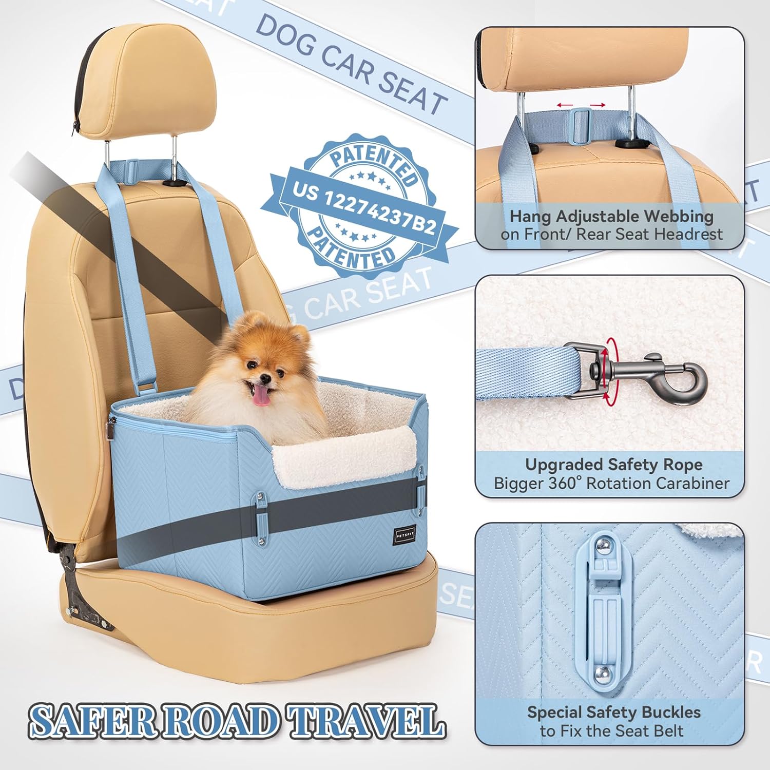 PETSFIT Dog Car Seat Medium Sized Dog, Stable Small Dog Car Seat for Car with Clip-On Leash, Fleece Liner Suitable for Small Pets Up to 25lbs (Blue)