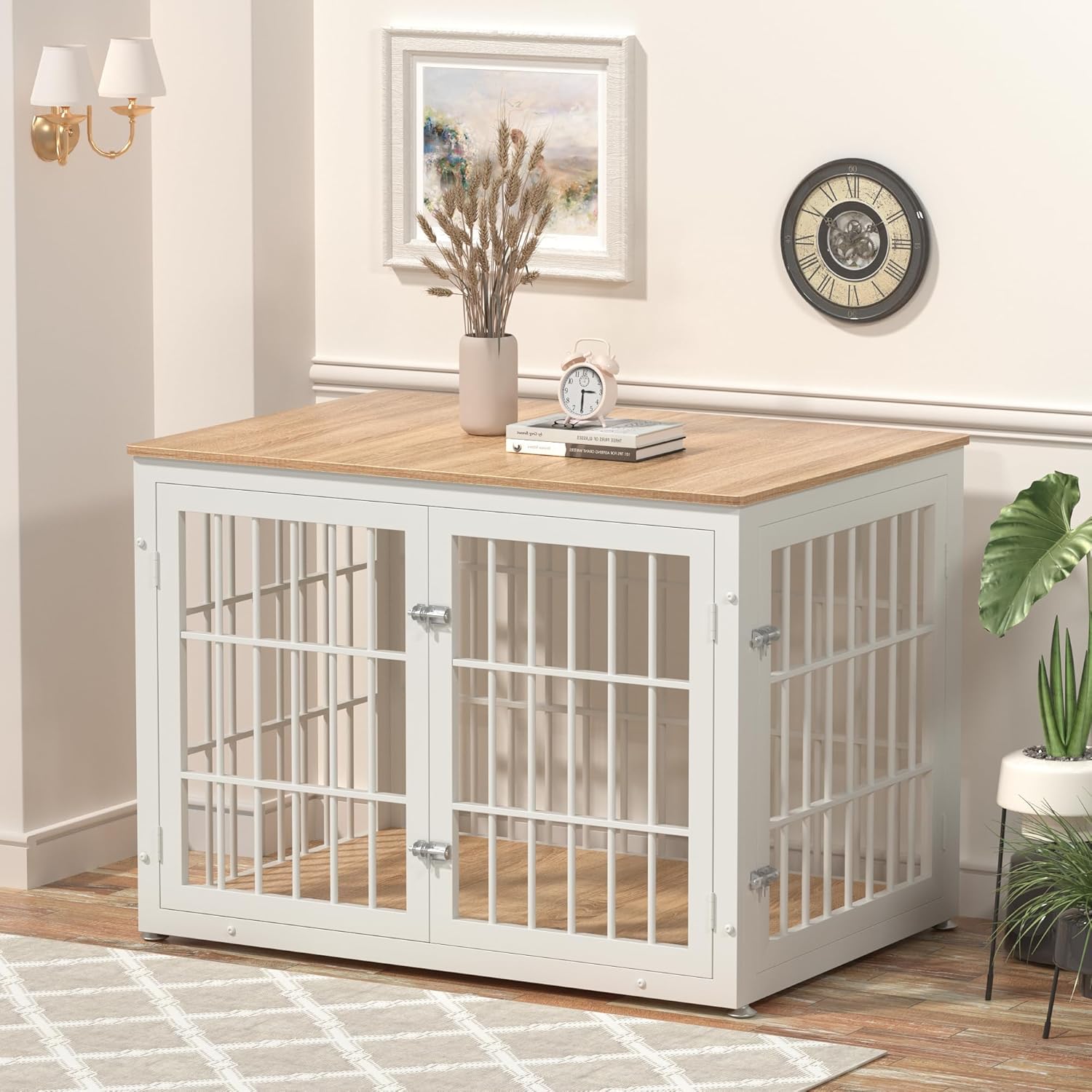 42 Inch Heavy Duty Dog Crate Furniture for Large and Medium Dogs, Decorative Pet House End Table, Wooden Cage Kennel Furniture Indoor, Natural and White