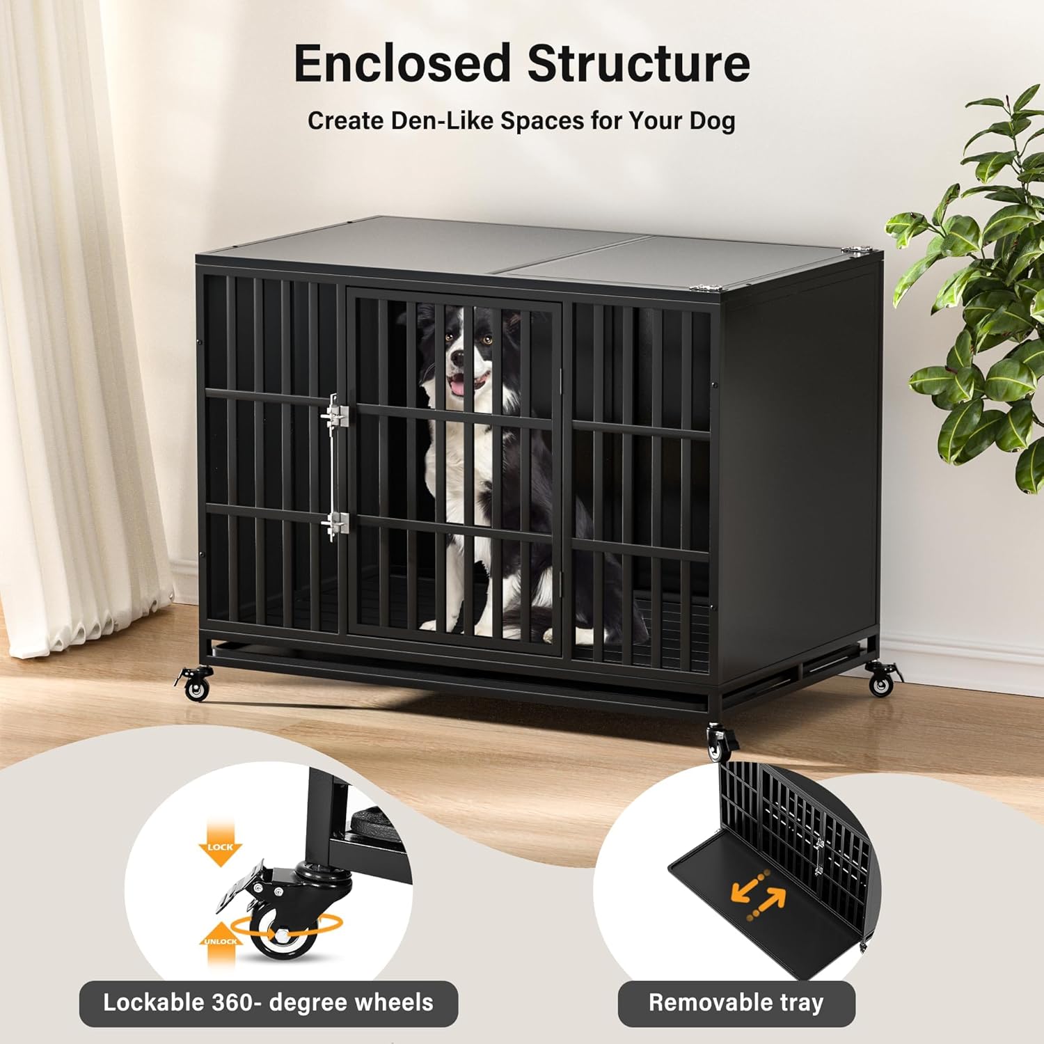 - Enhanced User Experience: The wide bottom panels with carefully designed slits (0.5 inch), along with removable trays, ensure easy clean-up without causing discomfort to your pet's paws. Additionally, lockable 360-degree wheels and top doors facilitate movement of the dog crate and interaction with your pet.