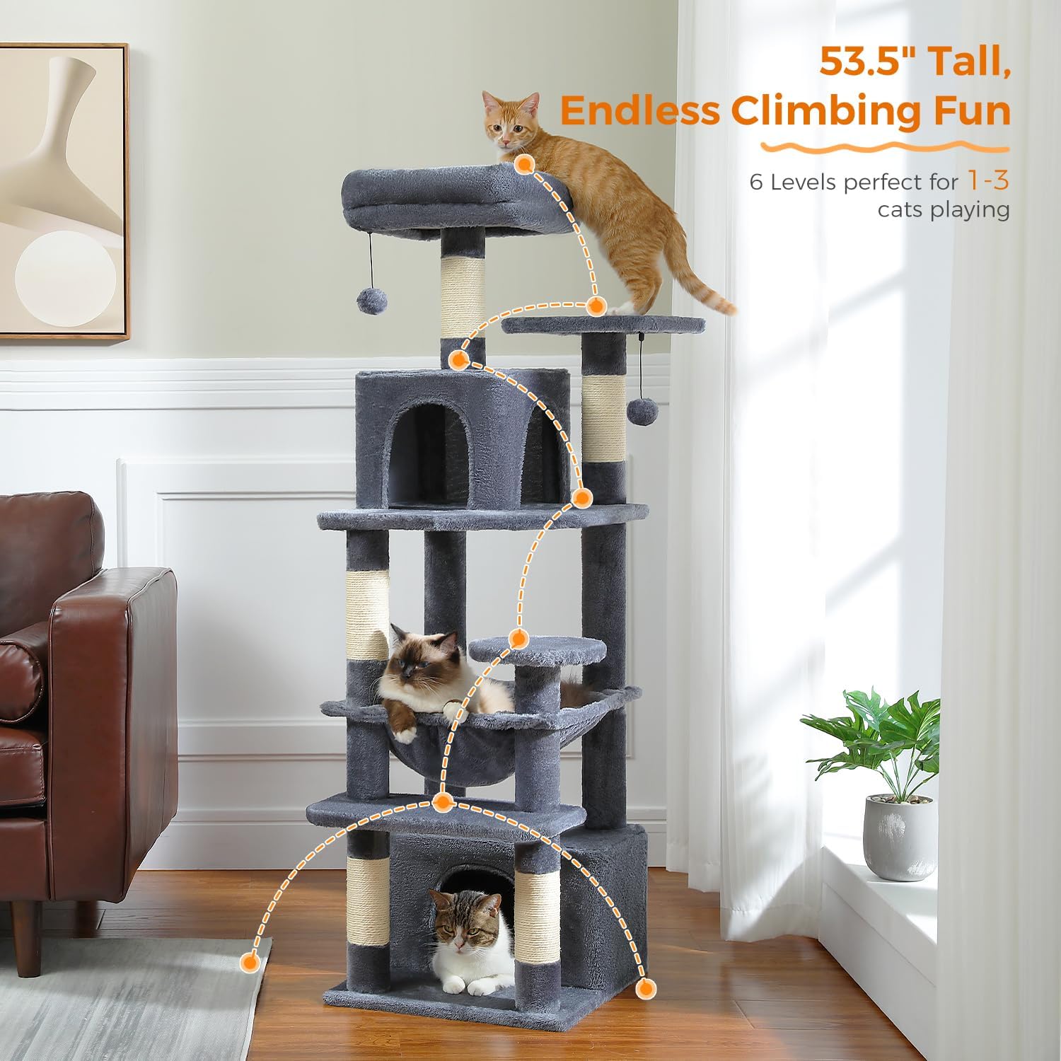 PAWZ Road Cat Tree, 53.5 Inches Tall Cat Tower with Spacious Hammocks, Condos and Scratching Posts, Cat House with Dual Padded Perches for Indoor Large Cats-Dark Gray