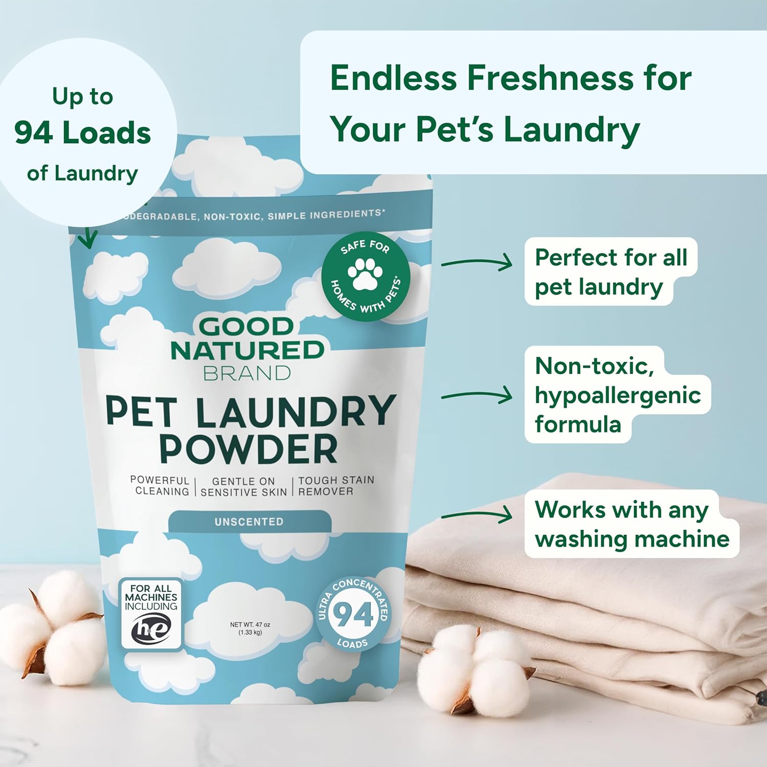 Good Natured Brand | Pet Stain & Odor Remover for Laundry | Pet Laundry Detergent for Dogs Beds, Cat Pee, Smell, Dog Drool | Hypoallergenic & Non-Toxic | Unscented | 47oz 94 Loads