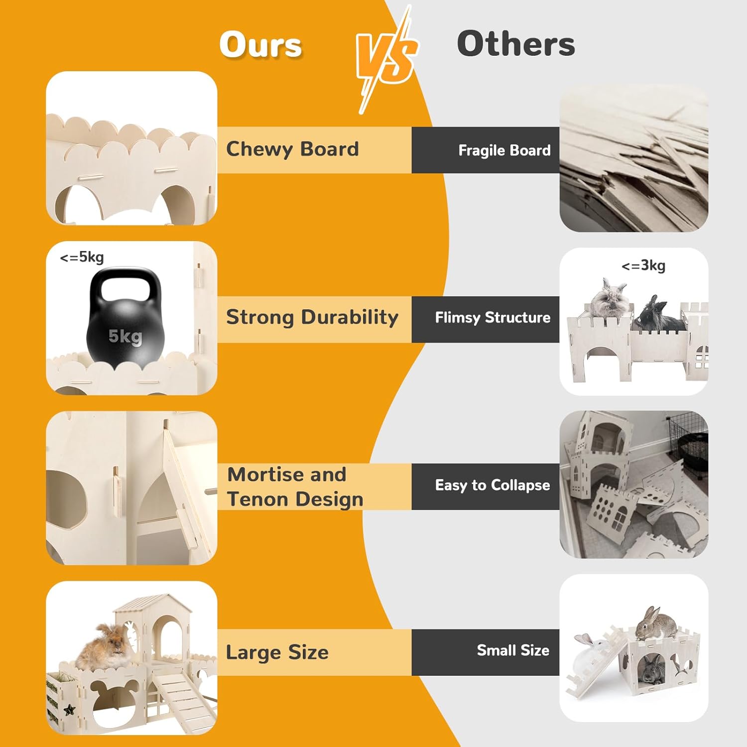 - 【Premium Materials】The bunny houses is made of poplar plywood. It is a safe and harmless material that processed from natural wood. Providing a healthy and cozy environment for your bunny to explore and rest. The board is thick enough for rabbits jump and run on the roof,which adds a lot of fun for the small pets.