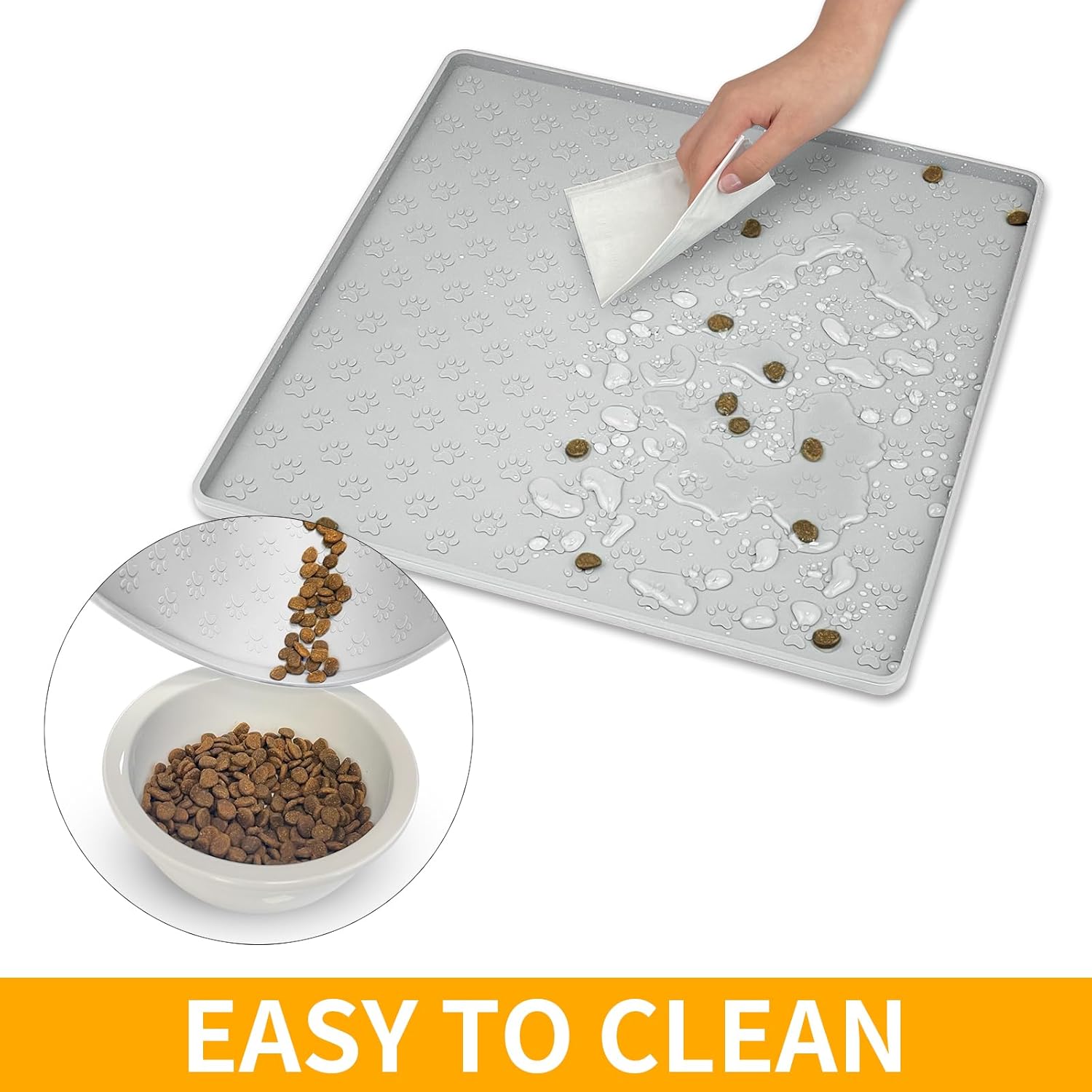 - Easy to Clean & Storage: This pet food mat can be wiped with a cloth or rinsed with water. Dishwasher safe. Soft dog feeder mat is easy to roll up for storage or take outdoors.
