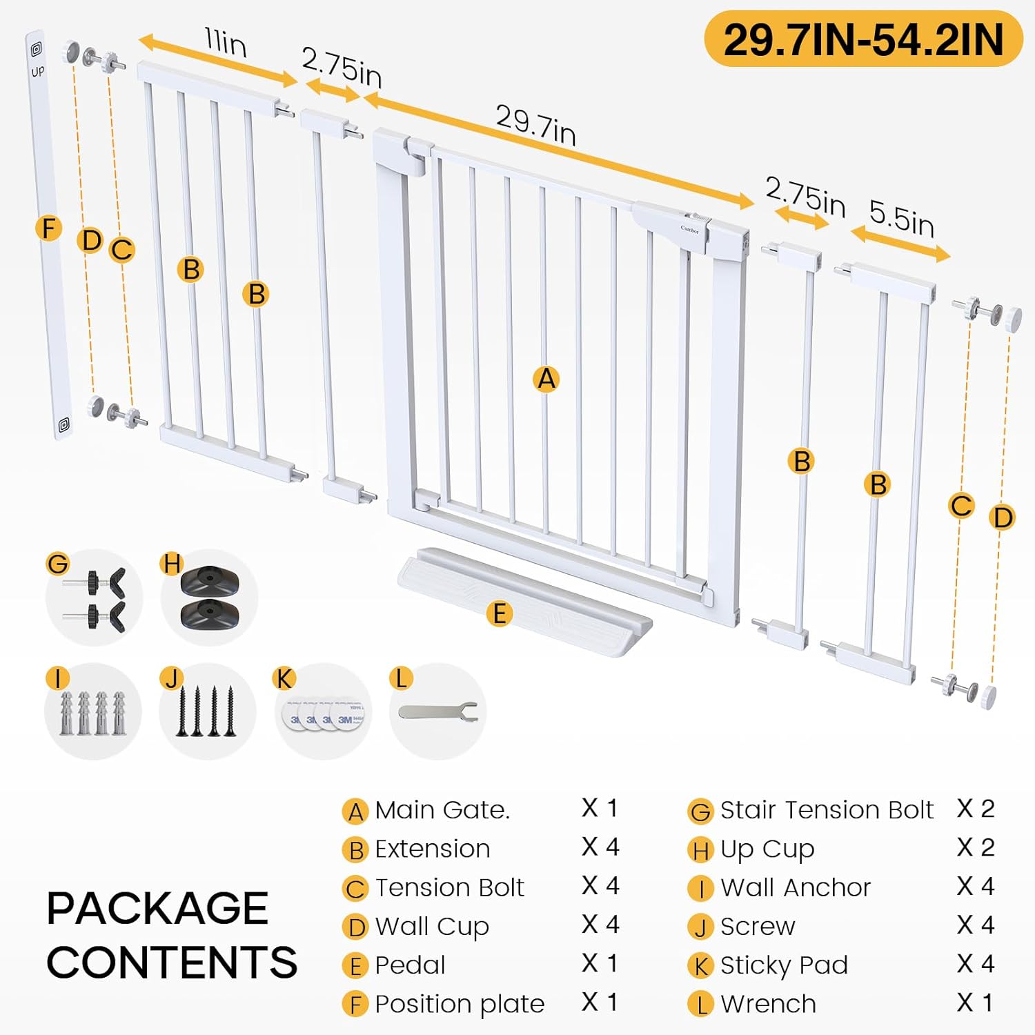- EXTRA-WIDE GATE COVERAGE – With a height of 30.5 inches and an adjustable width of 29.7 to 54.2 inches, this wide baby gate lets you block off stairways, bedroom doors, hallways, and other off-limit areas inside your home for better child or pet safety. A great choice for new parents