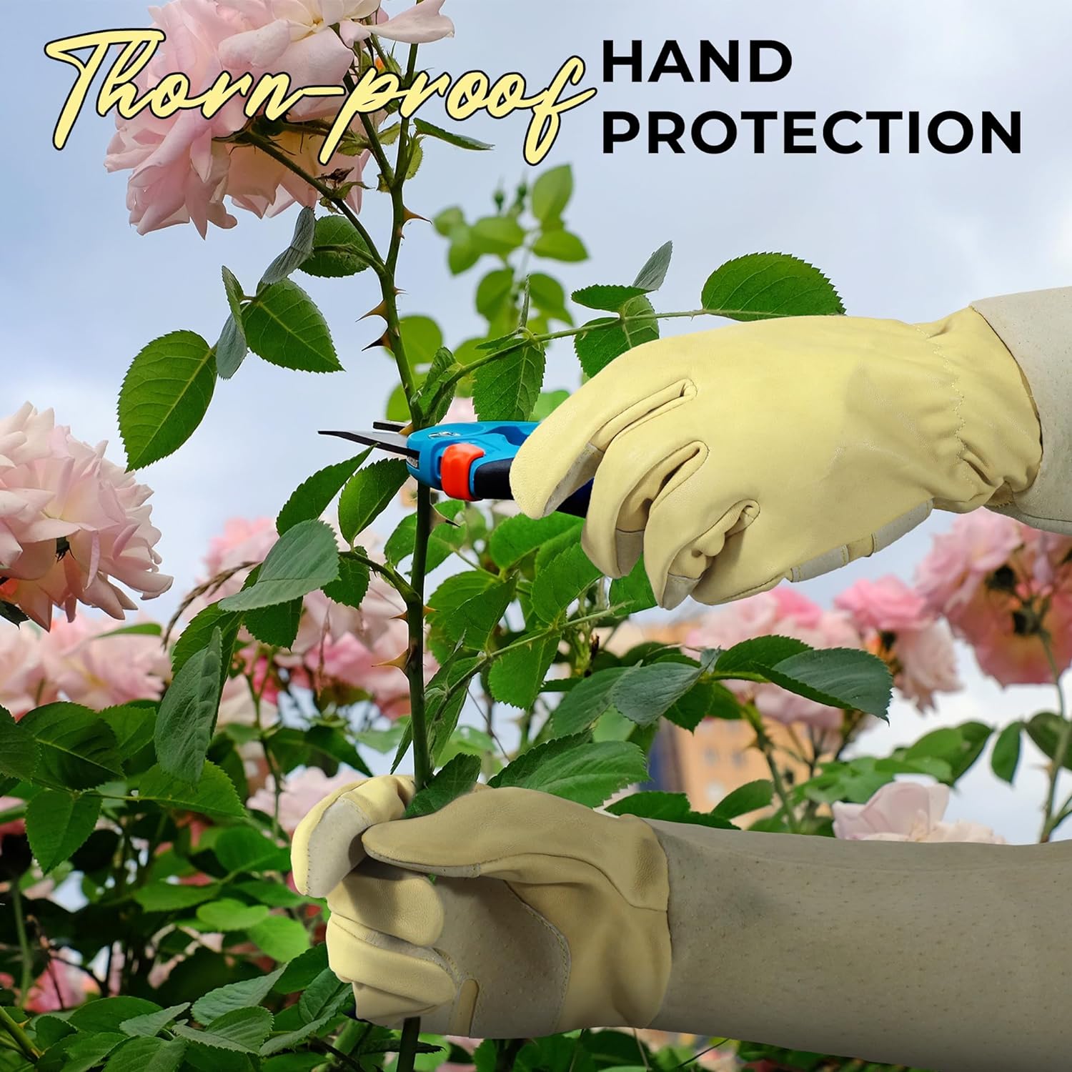 HANDLANDY Rose Pruning Gardening Gloves for Men Women, Thorn Proof Forearm Protection Leather Garden Gloves, Gardening Gifts for Gardeners (Beige- goatskin, Medium (Pack of 1))