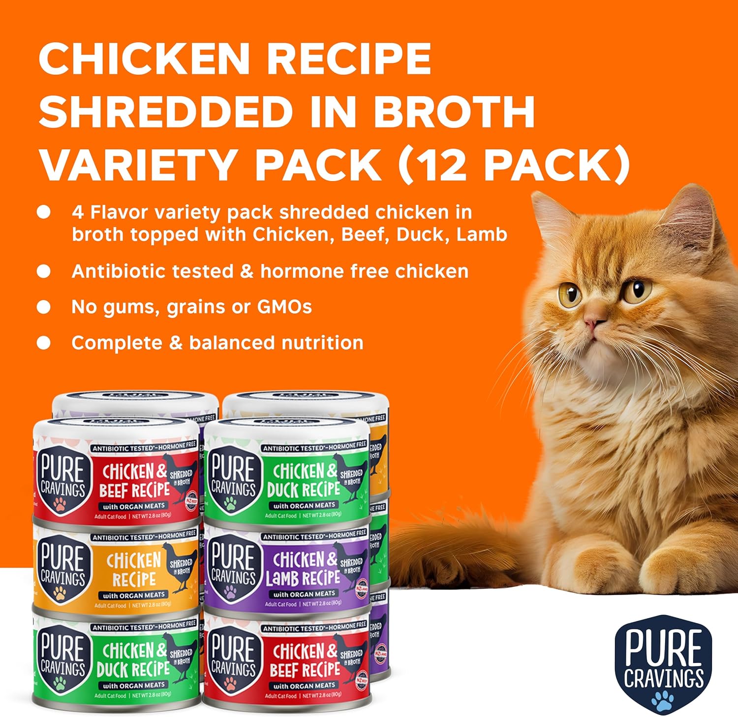 Chicken Recipe in Broth, Shredded Wet Cat Food, Variety Flavor Pack: Chicken, Lamb, Duck, Beef; Grain-Free Protein, Non-GMO