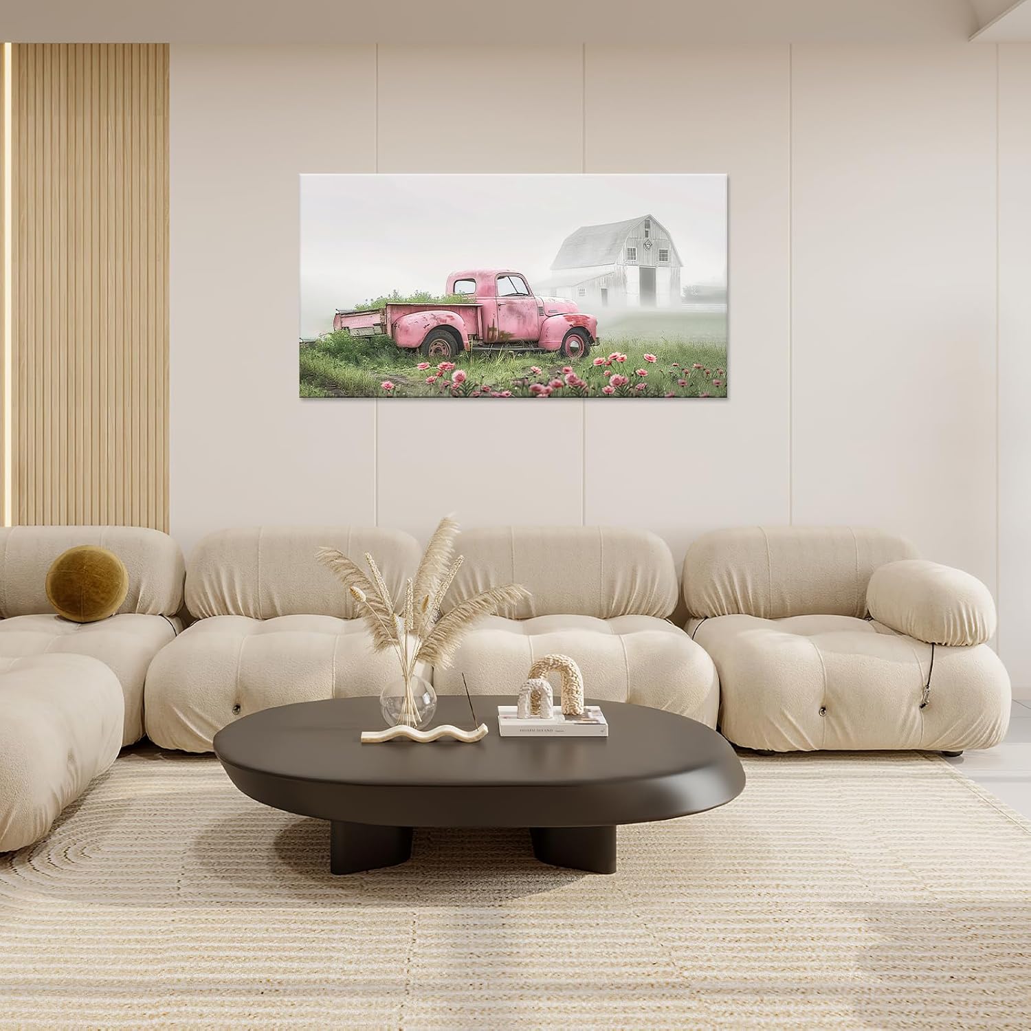 Large Rustic Farmhouse Pink Truck Wall Art for Living Room Country Barn Art Big Space Size Bedroom Office Framed Canvas Prints Pictures Painting Artwork Office Bedroom Home Decor 60"x30"