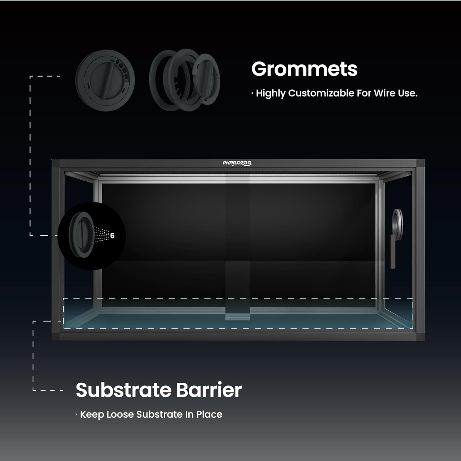 - ăEasy MaintenanceăFront opening reptile terrarium with door handles included for easy cleaning & feeding. No more suction cup problems or unsightly fingerprints all over. The substrate barrier keeps the substrate in place. Our tempered glass doors are durable enough to withstand scratching.