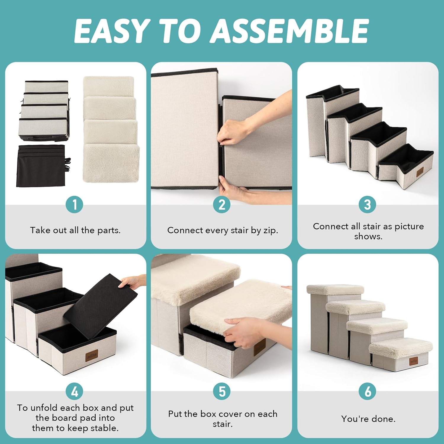 - 【Dog Stairs - Easy to Assemble】First, connect the zipper on each step, then fully unfold each step. Next, place each support board into the corresponding storage box and cover it. When not in use, simply remove the cover and store the stairs after folding them completely. This helps save space, making it ideal for small rooms. You can also watch our installation video in the product description below.