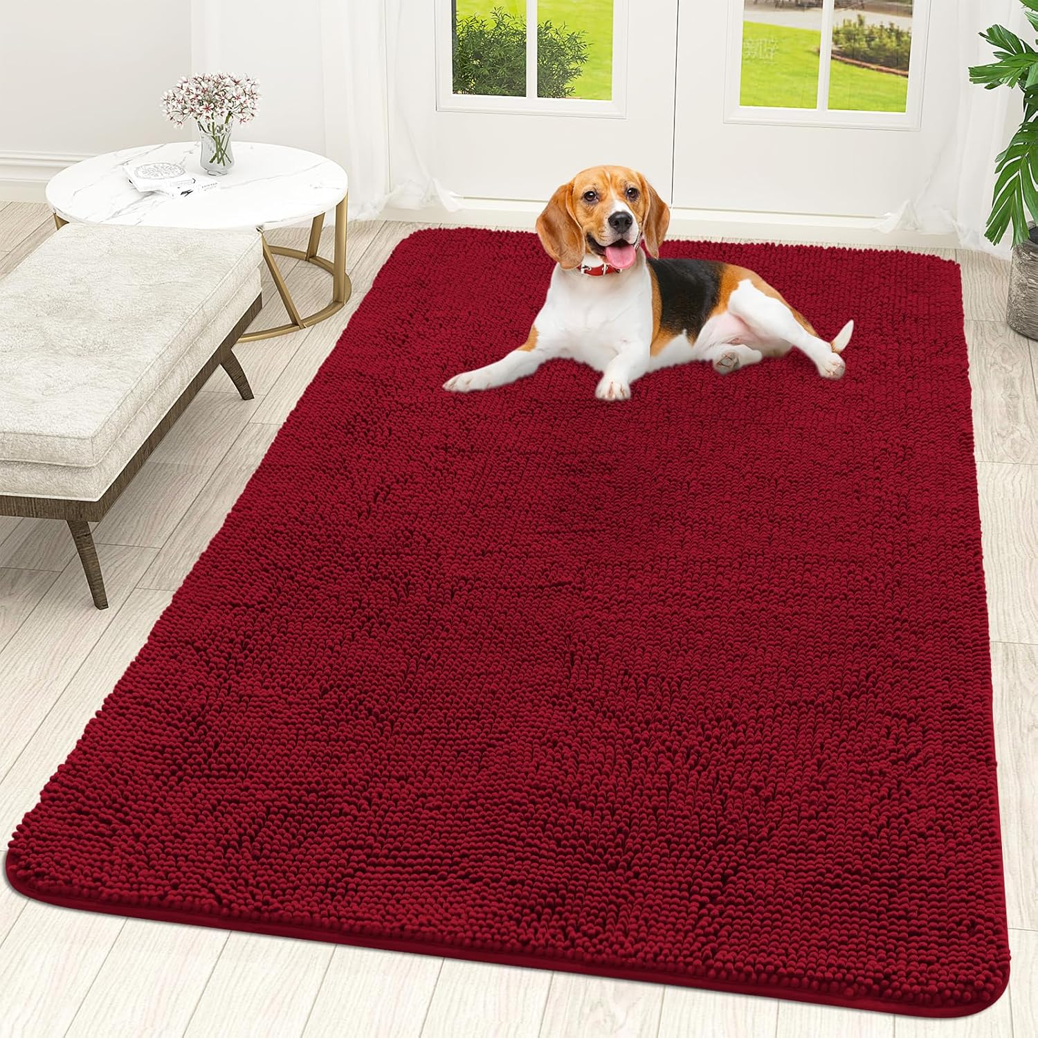 OLANLY Dog Door Mat for Muddy Paws 59x35, Absorbs Moisture and Dirt, Absorbent Non-Slip Washable Doormat, Quick Dry Chenille Mud Mat for Dogs, Entry Indoor Entryway Carpet for Inside Floor, Red
