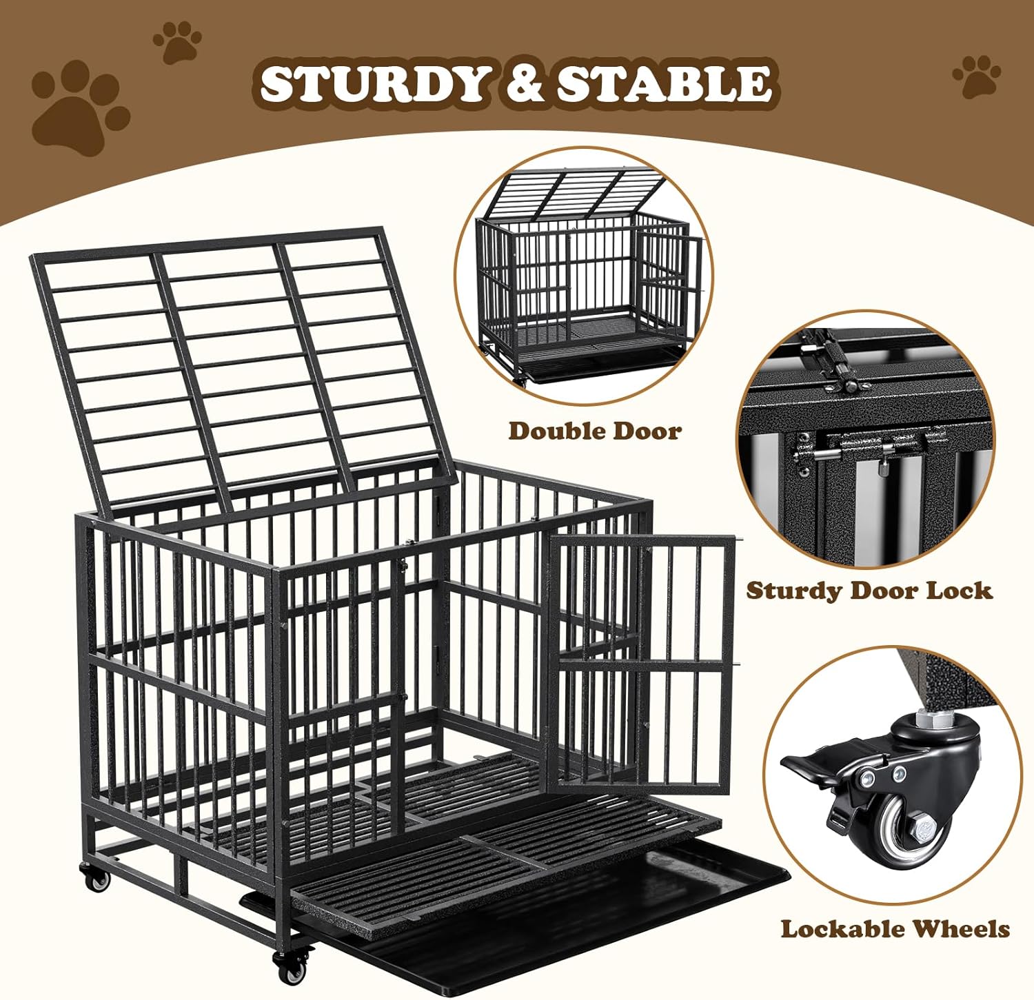 Dog Crate with Removable Tray, 37/42/46 Inch Indestructible and Escape Proof Steel Dog Cage Kennel for High Anxiety Dogs, Heavy Duty Dog Crate with Wheels, Double Door, Extra Large XL XXL