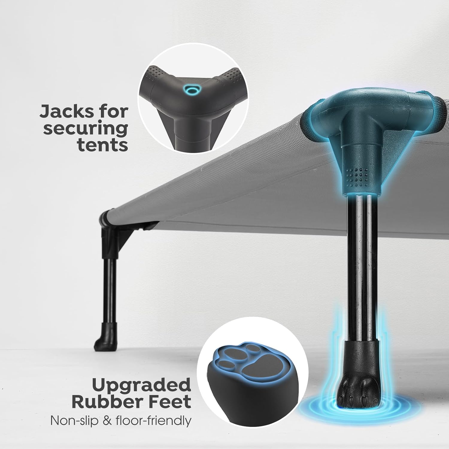 - Say Goodbye to Anxiety! Our dog cot is composed of powder-coated steel tube, durable textilene fabric, and non-skid rubber feet. Strong stability and high load-bearing capacity means saying goodbye to the fear of a sudden bed collapse.