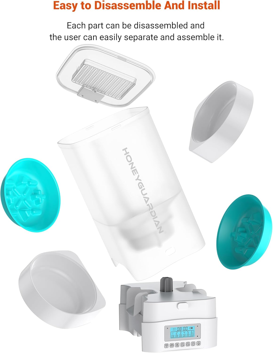 - [Easy to operate, easy to disassemble and wash] The automatic feeder is easy to set up and you can set up a feeding schedule in minutes. The top cover, clear food bucket and Slow feeder bowl can be removed from the main unit and cleaned with water. In addition to the main unit, other parts of the cat feeder should be cleaned regularly to provide a clean and healthy feeding environment for your pet.