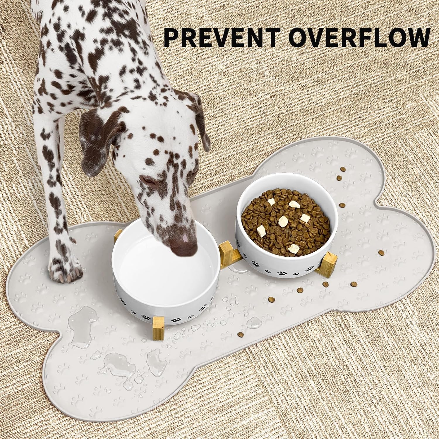 - Raised Edge - The high edge of this feeder mat keeps food and water within the tray and prevents spillage onto a clean floor. Keep your living space tidy and clean, say goodbye to messy floors, you just need to clean the dog bowl mat regularly.