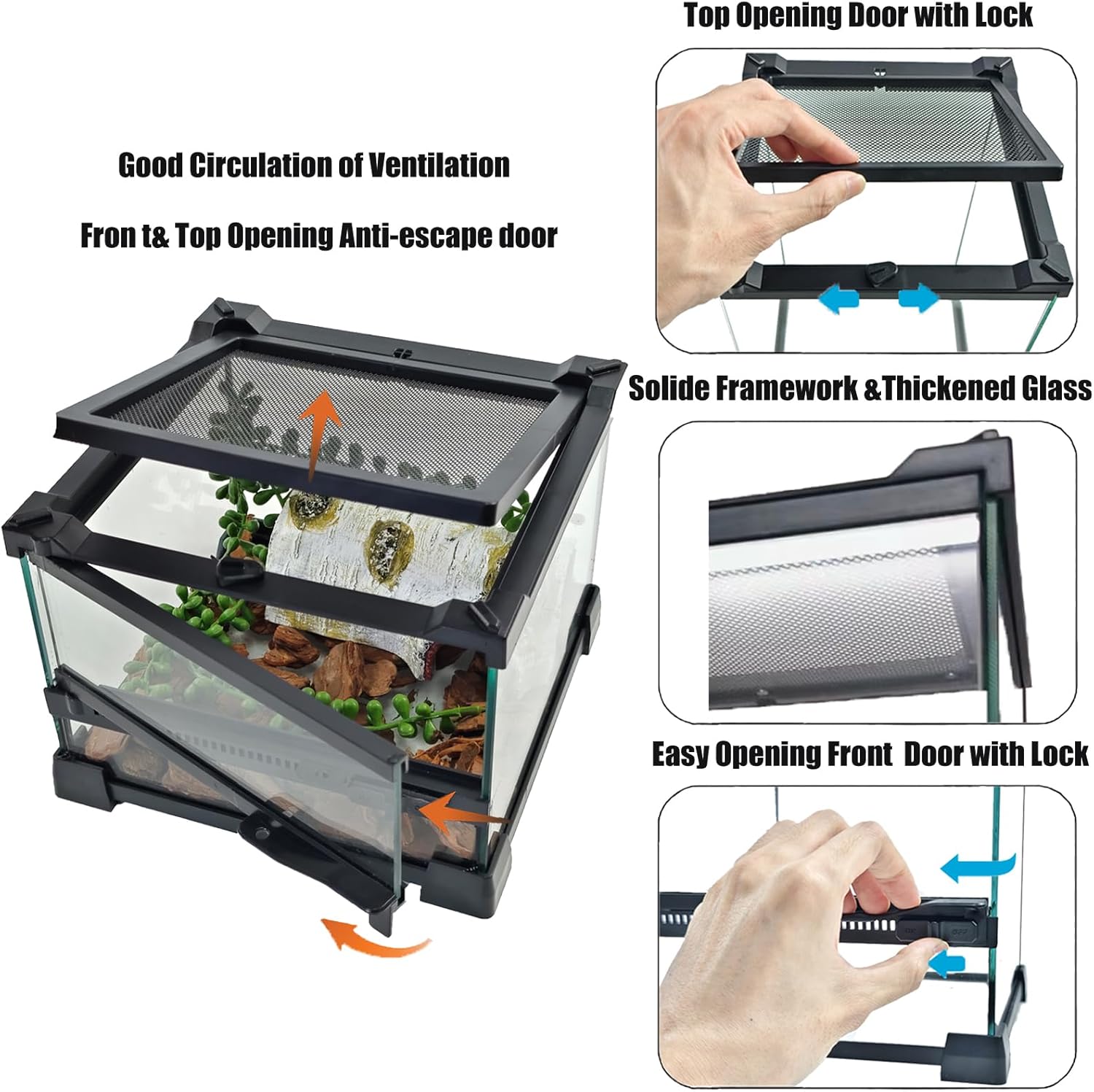 - 【Two ways of opening】- The metal mesh at the top can open completely, The side door can be opened with one hand for easy feeding or decoration, and both doors have locks to prevent your pet from escaping.