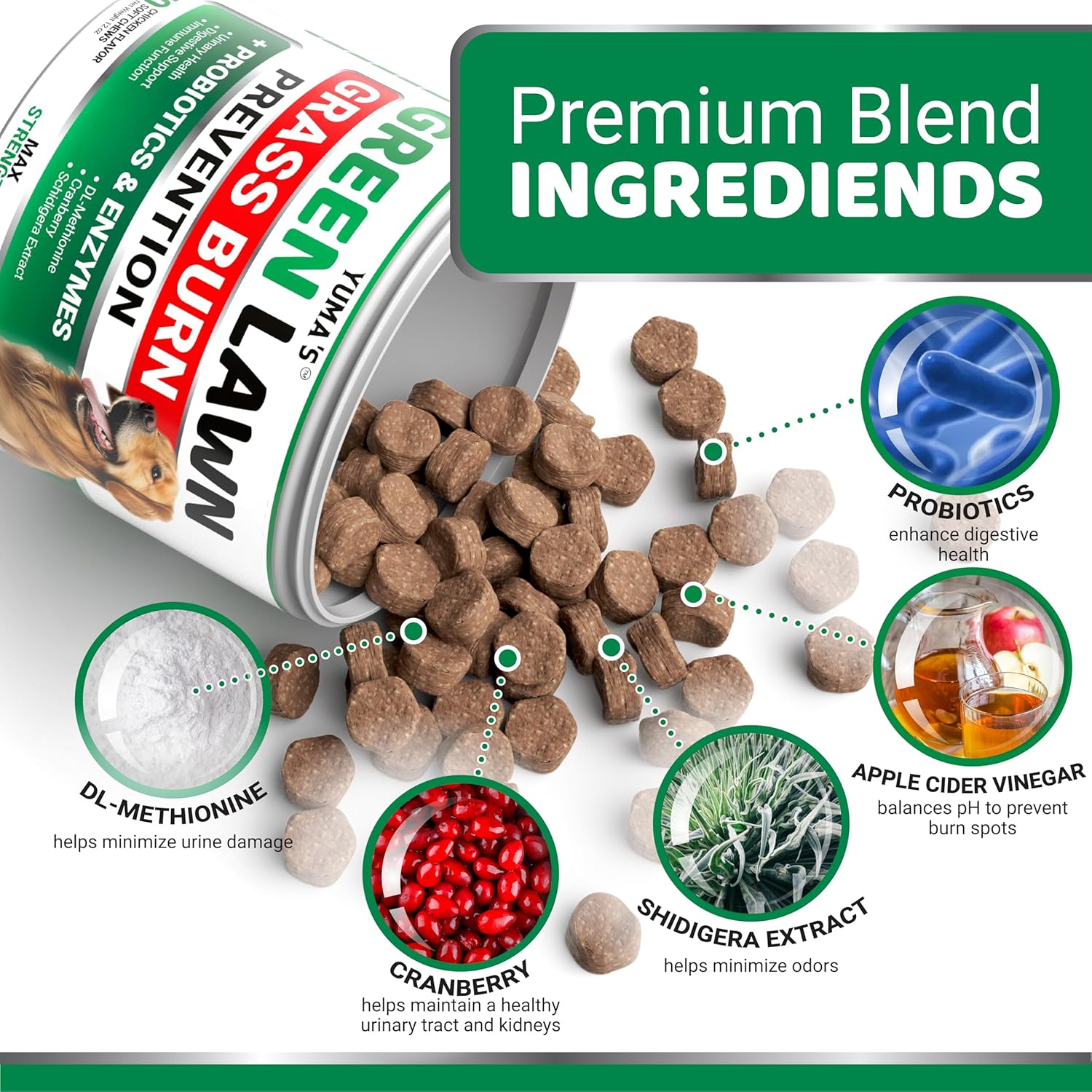 - Support Digestion and Protect Your Lawn: Our chews, with enzymes and probiotics, promote digestion and bowel health. They also maintain normal urine pH levels to reduce yellow patches, similar to dog rocks for urine burning grass.