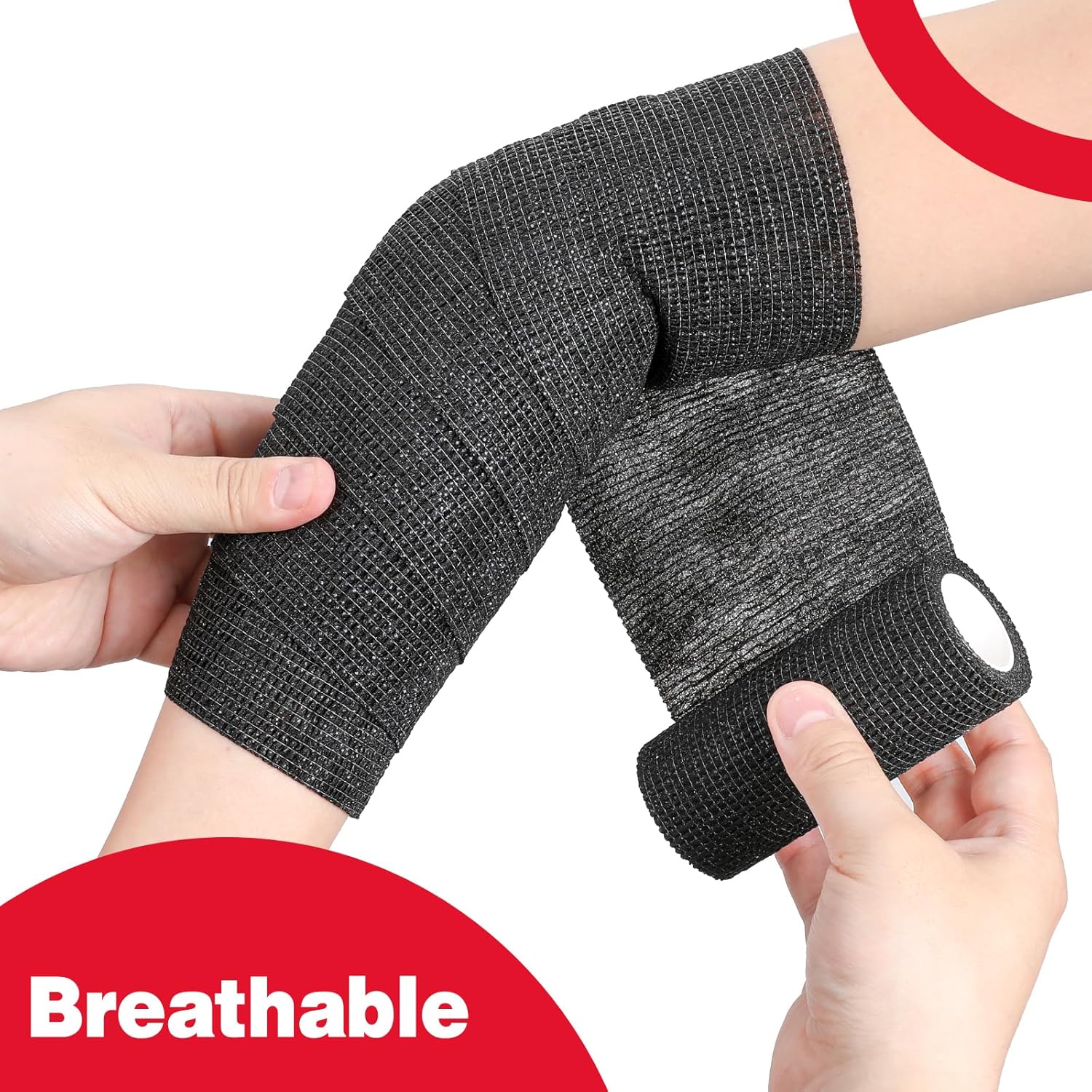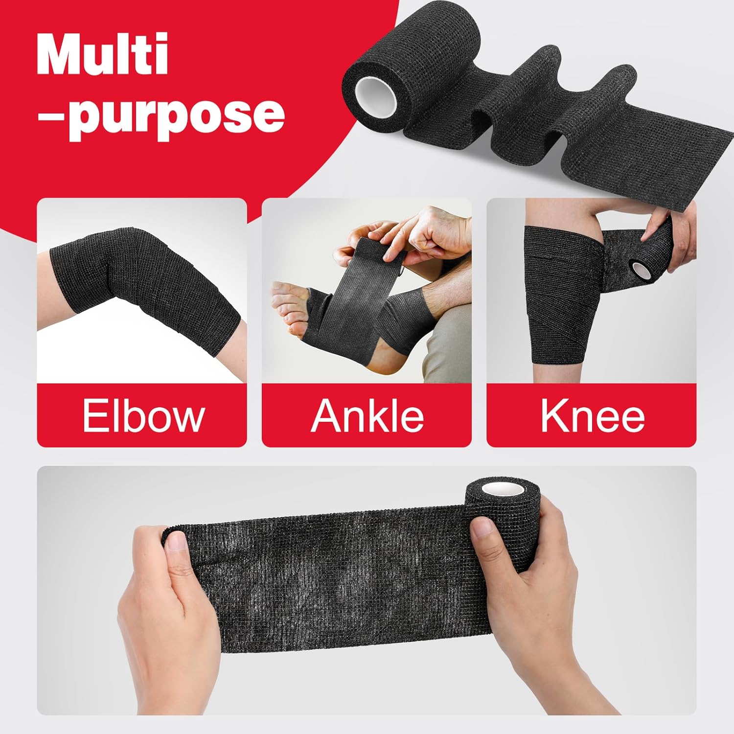 - Self Adhesive Bandage: Package includes 9 rolls of black self adhesive bandage wrap. Each roll measures 4 inch wide and 5 yards long after stretching. It easily adheres to itself but will not stick to other surfaces such as skin or hair, making it easy to pull off and change bandages