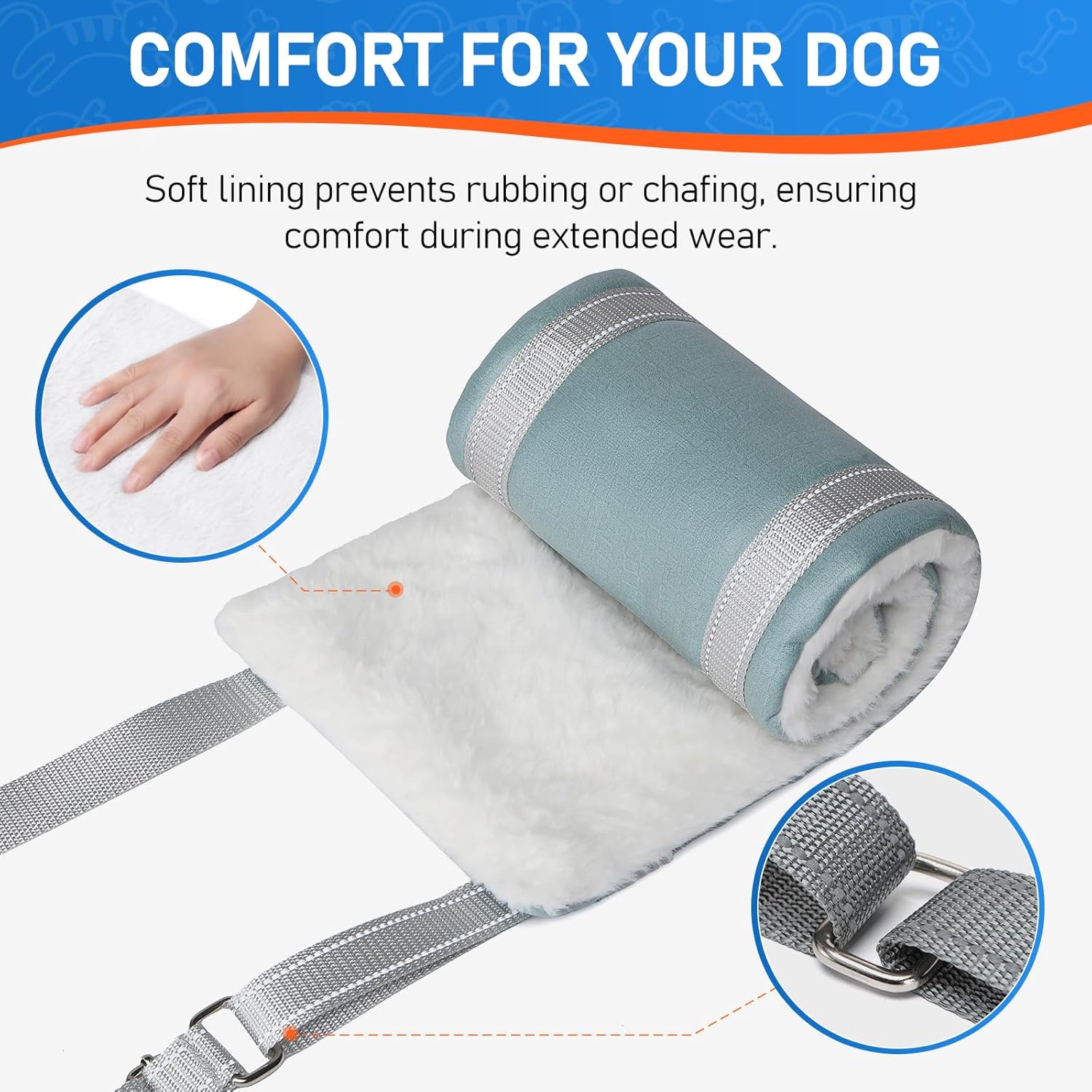- COMFORTABLE & SAFE - Our Dog Lift Harness has padded faux rabbit fur for comfort. It has secure fasteners and adjustable straps for a secure fit, preventing discomfort or slipping