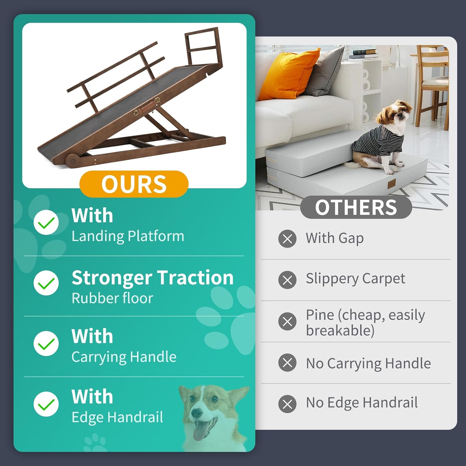 - STURDY & DURABLE: Our pet ramp for dogs and cats is specially made very well - solid wood construction and sturdy stainless steel fasteners, which has been tested to support up to 200lbs. When they jump off the bed, sofa, and sofa, there is no need to worry about getting injured, which provides safety for your pet.