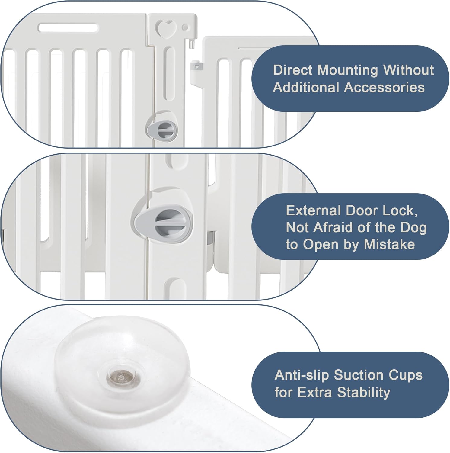 - NON-SLIP STABILITY: Our dog fence features non-slip suction cups that keep it securely in place on smooth surfaces. Your active pets can play safely without knocking down the playpen.