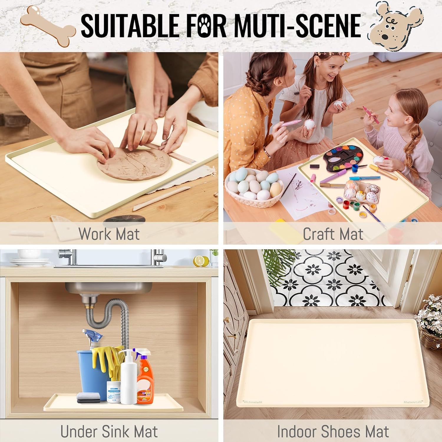 MateeyLife Dog & Cat Food Mat, Waterproof & Nonslip Silicone Feeding Mats for Dogs and Cats, Raised Edge Tray for Messy Drinkers, 18"x12", Beige