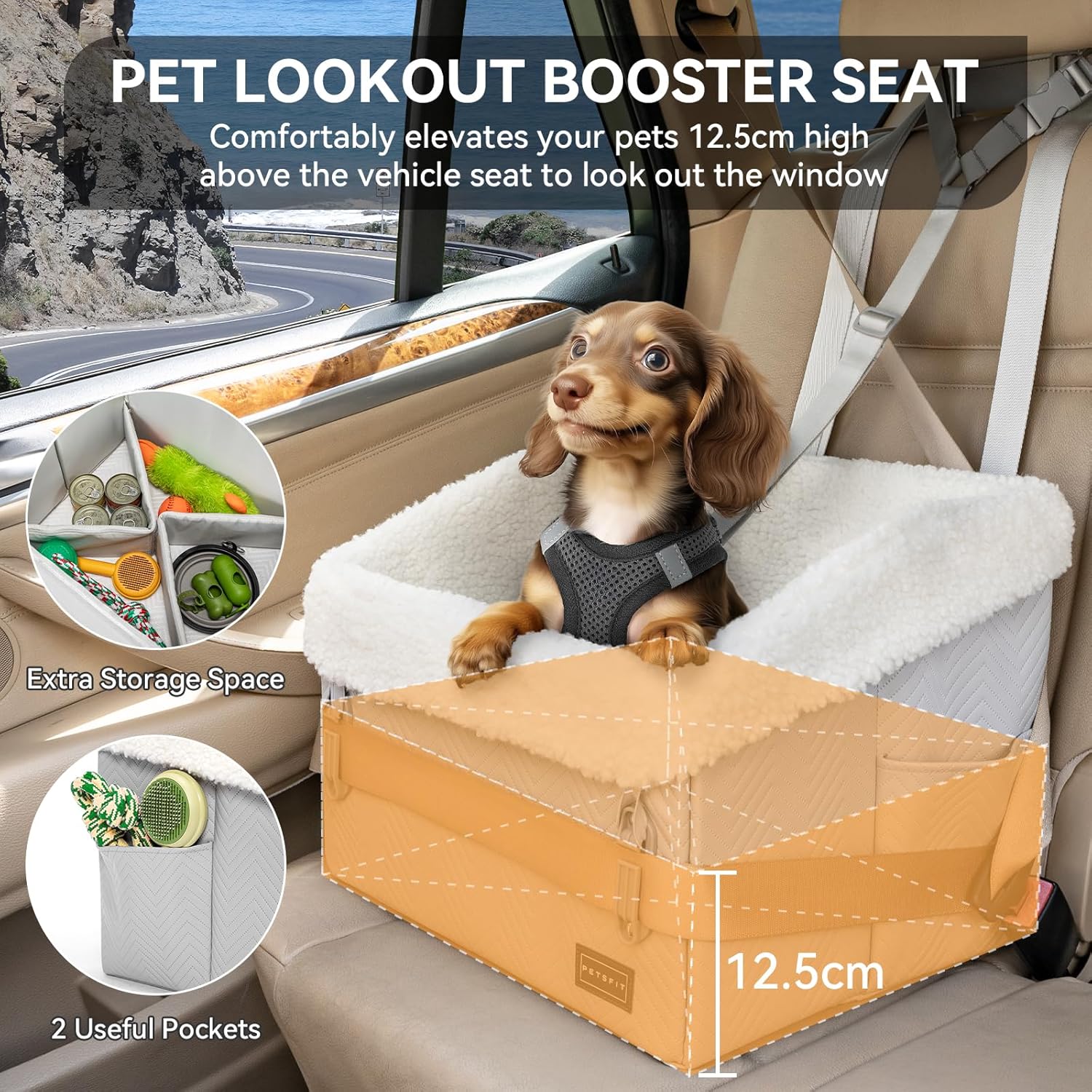 - [Dual-Sided Comfort Cushion] The dog booster car seat medium sized dog featuring a unique cushion design with one side soft fleece and the other durable Oxford cloth, it meets different weather and pet needs. The cushion is detachable and washable. With comfortable fleece-lined edges, the car seat for dogs offers your pet a first-class comfort experience during rides