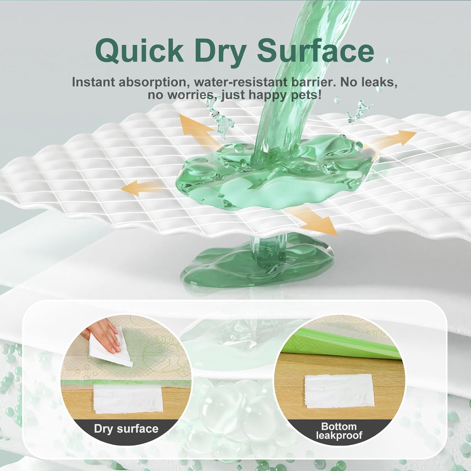 - 【Rapid Absorption】Grid design for diversion function, which help to expand the absorption area, ensuring faster urine penetration. With an impressive 2400ml capacity and ultra-fast absorption rate, our pee pads excel in maintaining dryness, keeping your pet comfortable and free from wetness on its belly, legs, or paws.