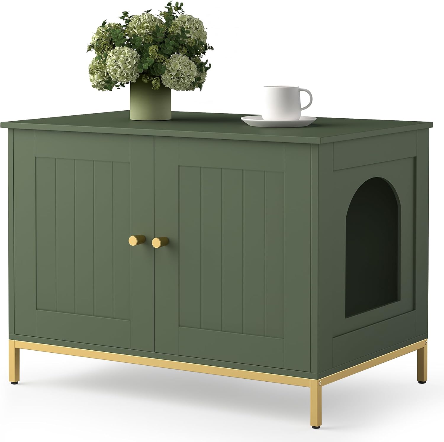 Homhedy Cat Litter Box Enclosure, Cat Washroom Furniture with Metal Frame, Pet House, Fit Most of Litter Box, Modern Style, Green and Gold