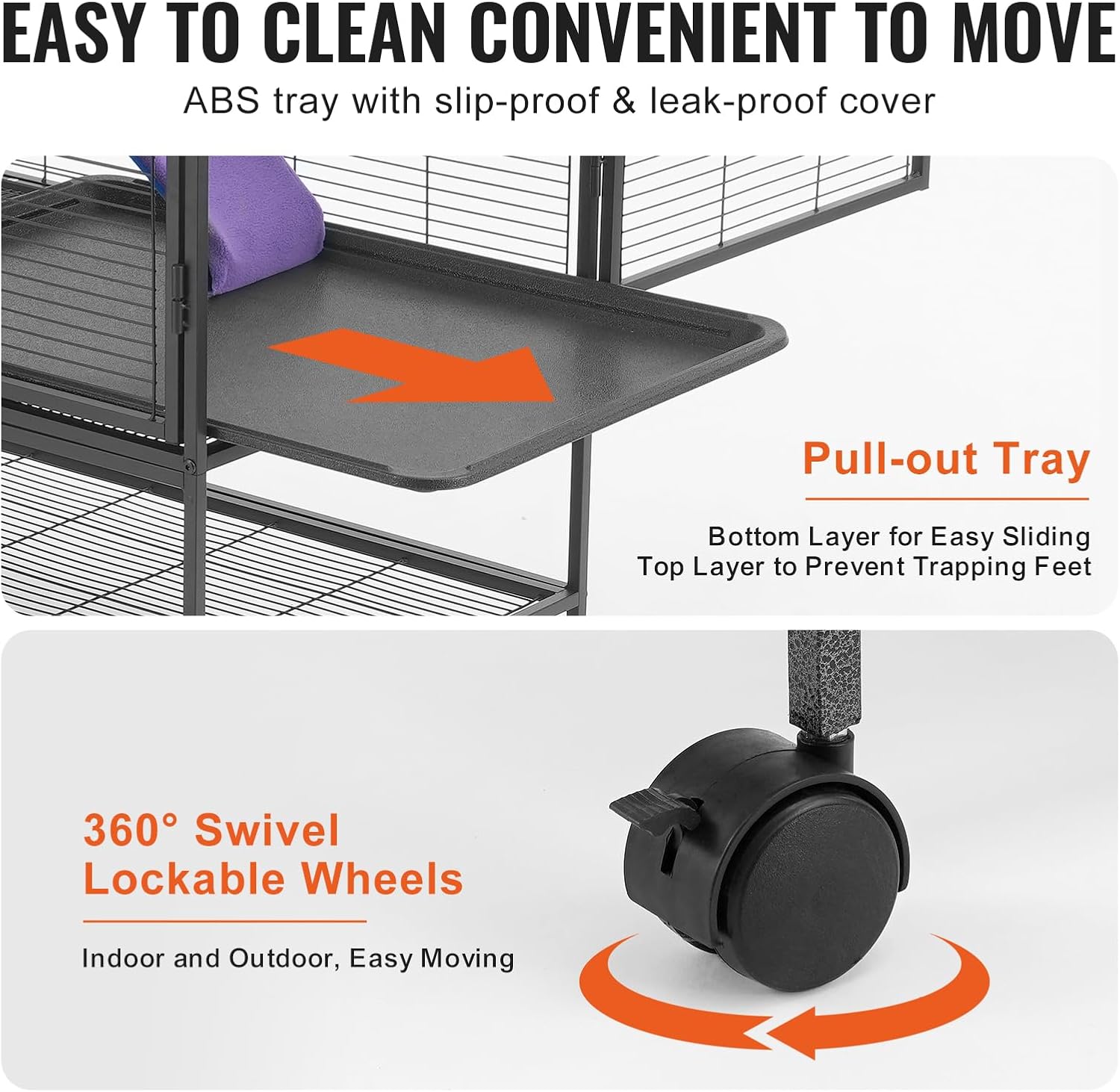 - Easy to Clean: The removable platforms and grids make the small ferret cage cleaning easy. The ABS-coated metal bottom tray fits tightly with the metal mesh to prevent urine leakage and foot injuries, providing a safe environment.Vevor ferret nation cage with the pull-out design and openable front door facilitate quick and convenient cleaning.