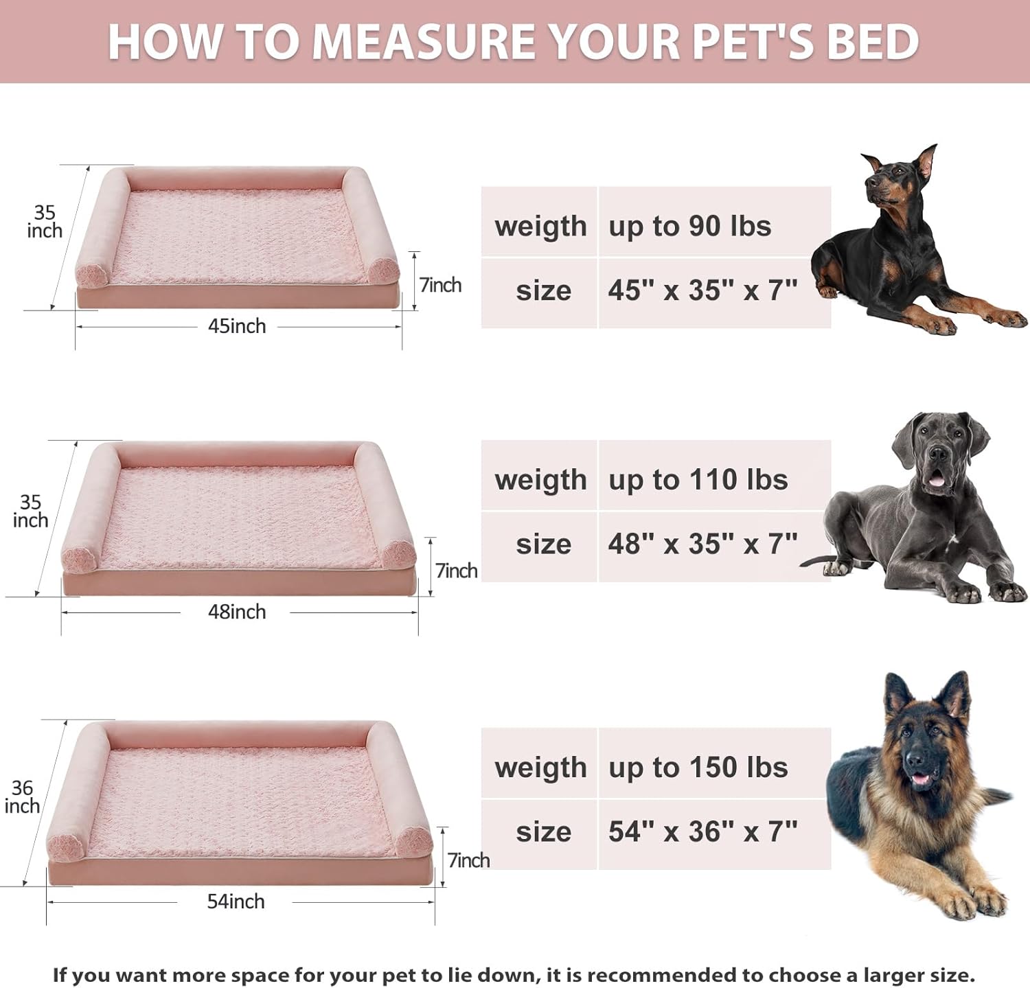 • DIMENSIONS (DOG BEDS FOR MEDIUM DOGS): jumber plus dog bed 54" x 36" x 7" (3.5" bolstered side ) for medium and large dogs up to 150 lbs. For dogs that like to roll around, sizing up will be more comfortable.