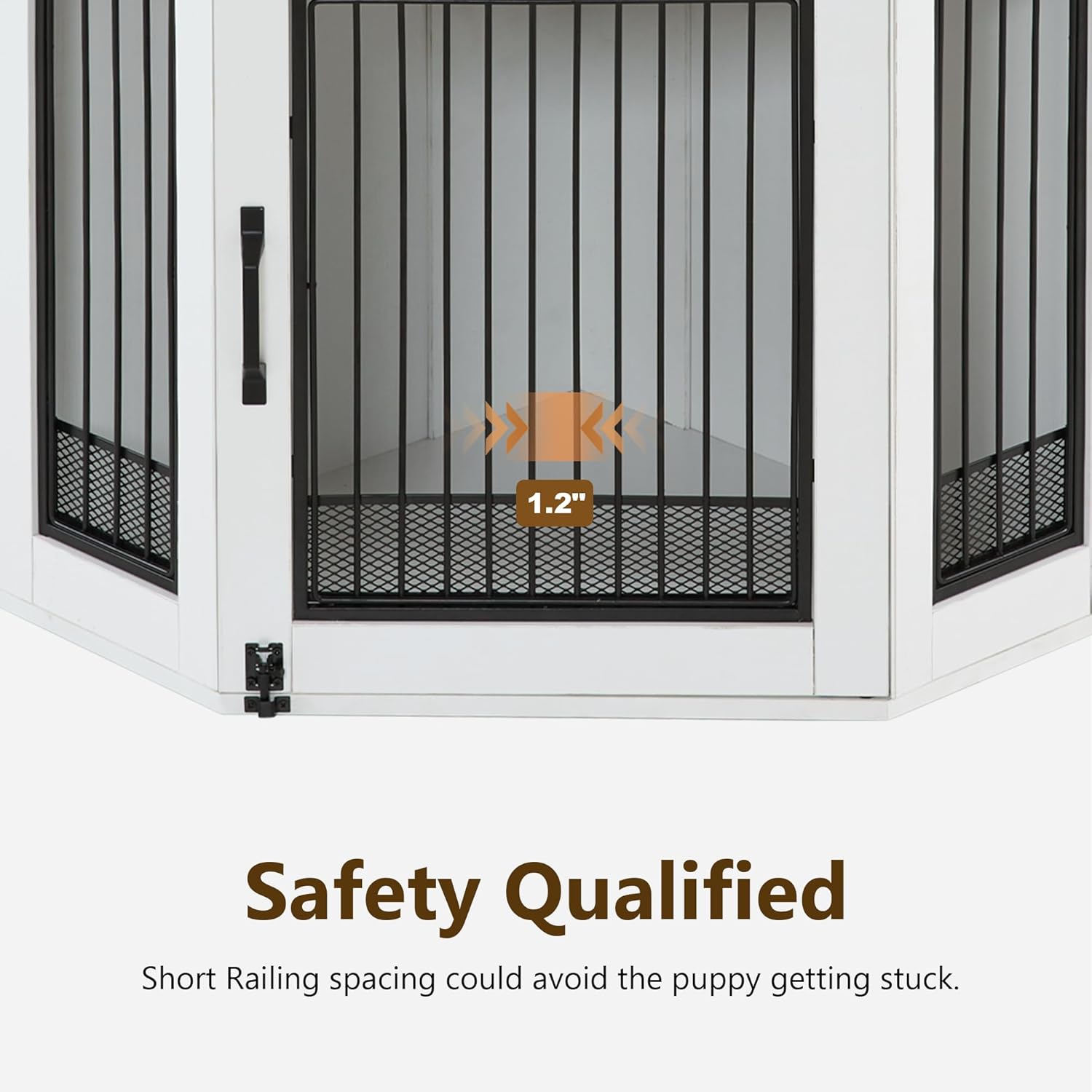 - Safety Protection: The distance between pet kennel bars is 1.2" to prevent the puppy from getting stuck. Anti-tip straps and non-slip pads could avoid the wooden dog house topple.
