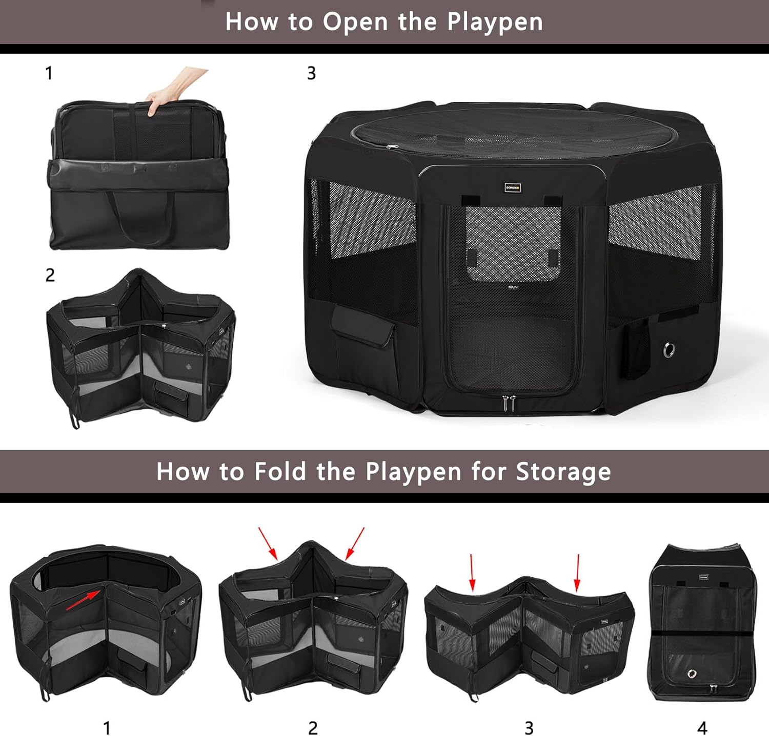 DONORO Dog Playpen Portable Pet Play Pens for Small Dog/Cat/Rabbit/Chicks, Cat Playpen Indoor/Outdoor with Carring Case, Removable Zipper Top and Bottom (Black, Large (46"x46"x23"), 8)