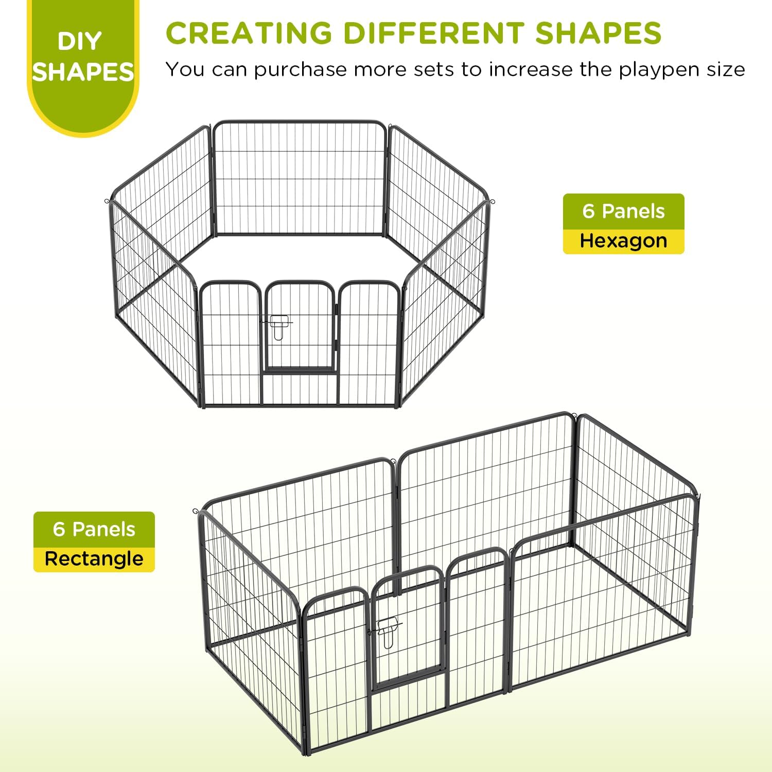 - EASY SETUP & CUSTOM CONFIGURATION: No tools are required. Shape this play pen into a square, rectangle, or octagon. Expand with panels to build a dog fence, large playpen, or dog run area.