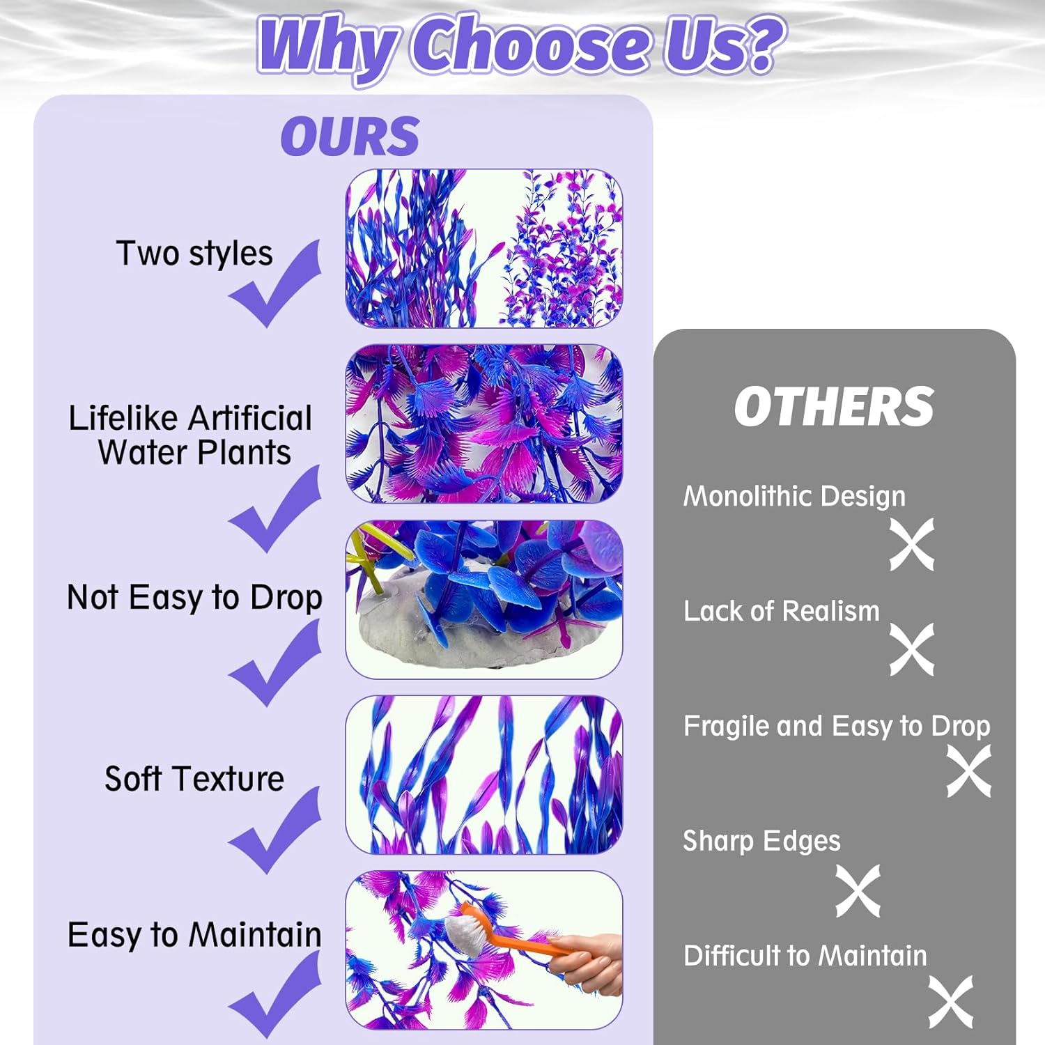 - RELIABLE MATERIAL : Our fake water plant leaves and roots are made of soft plastic material that won't affect the water quality. The leaves do not have sharp edges and have a soft texture, which can effectively avoid any physical damage to the fish while swimming or playing, and can better beautify the e-nvironment, maintain stability and not fade. Provide a comfortable and clean living e-nvironment for fish. Whether placed in a saltwater e-nvironment or freshwater e-nvironment, it can be perfectly adapted