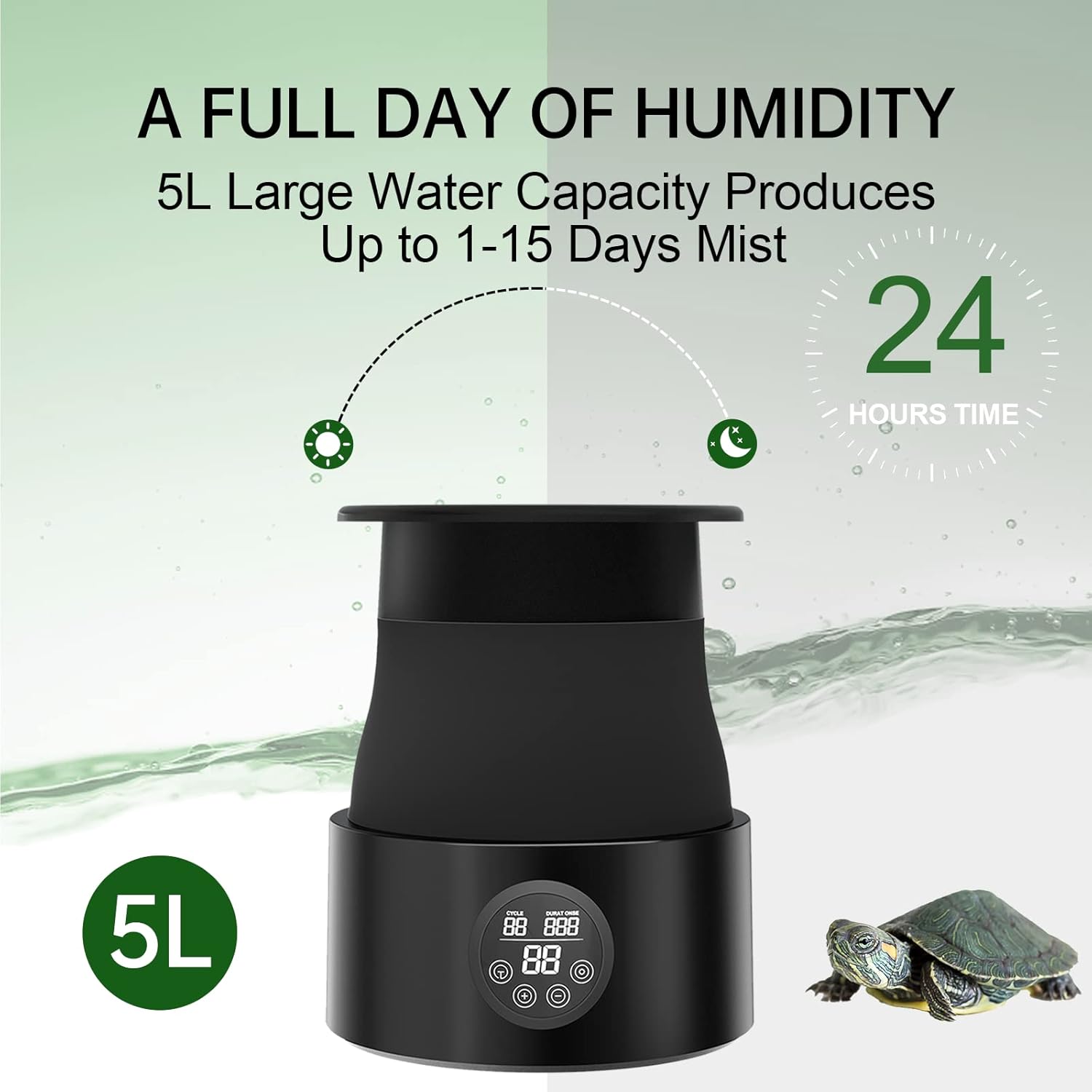 - 【5L Large Tank & Foldable】 The misting system for reptiles comes with a 5L water tank, allowing for up to 15 days of continuous use. The water tank features a foldable design, optimizing space and facilitating easy storage and portability.