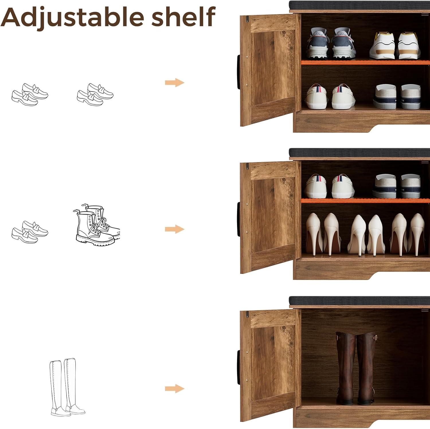 - Keep Your Shoes Organized: The depth of bench is 13.8 inches, which makes it easily to put in your shoes, meanwhile shoes of various heights can be placed by adjusting middle movable boards. The bench doors design ensures not only your privacy, but also a tidy space