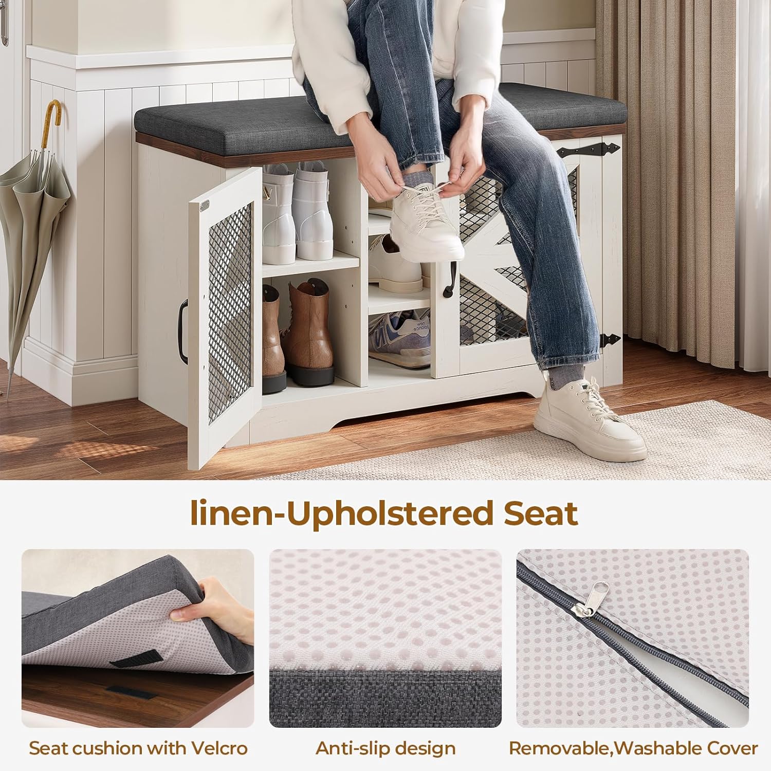 - COMFORTABLE AND CONVENIENT: This entry bench seat not only offers shoe storage but also comes with a soft cushion and an extra-long bench. It provides a comfortable seating area while putting on or taking off shoes. The soft and comfortable cushion adds to the overall convenience, keeping you in a good mood before heading out.