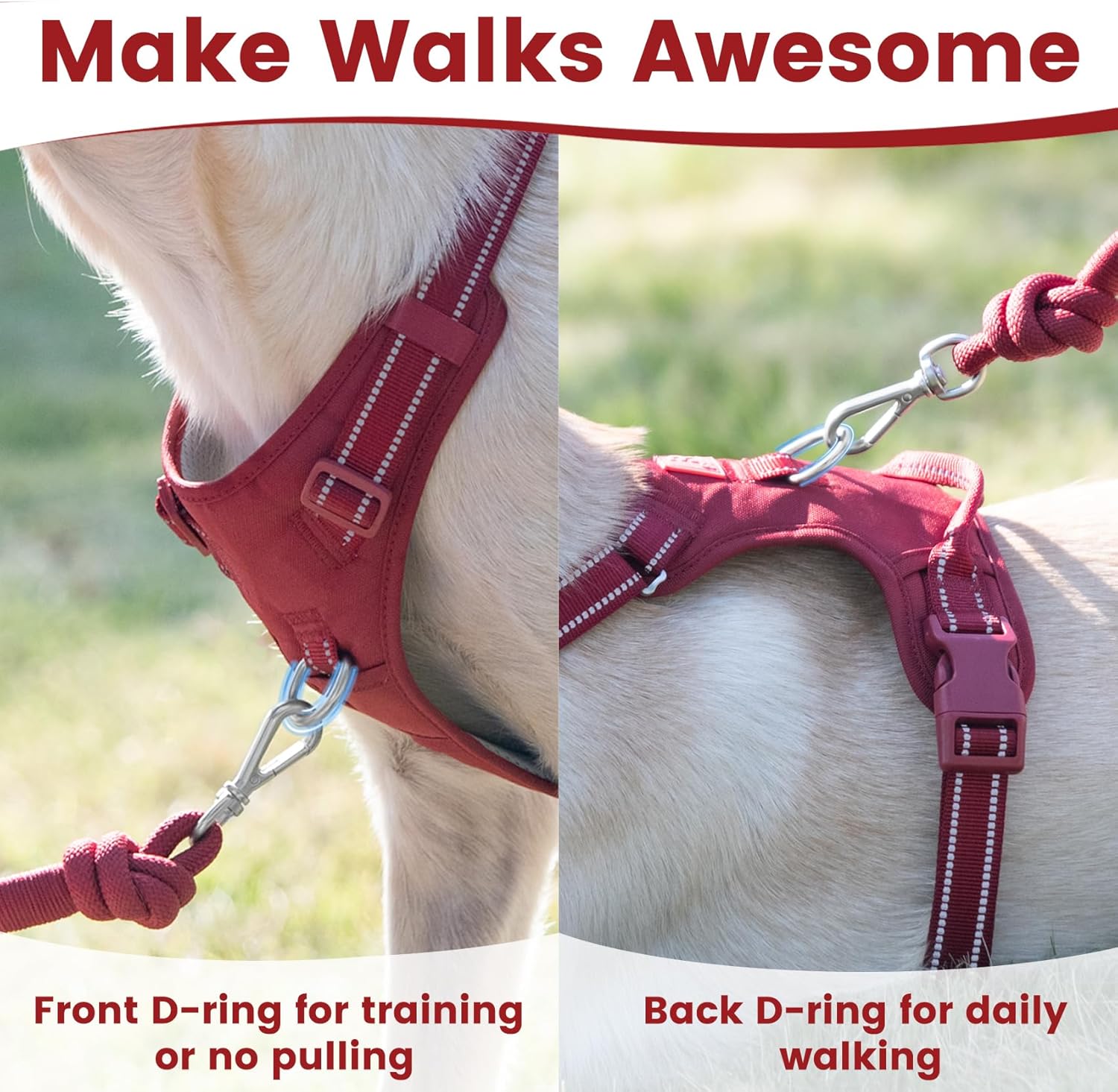 - No Pull and No Choke : Features a front D-ring to help guide your dog, reducing pulling and making walks more manageable. Back D-ring for a safe, secure leash attachment, ensuring comfortable and controlled daily walking.