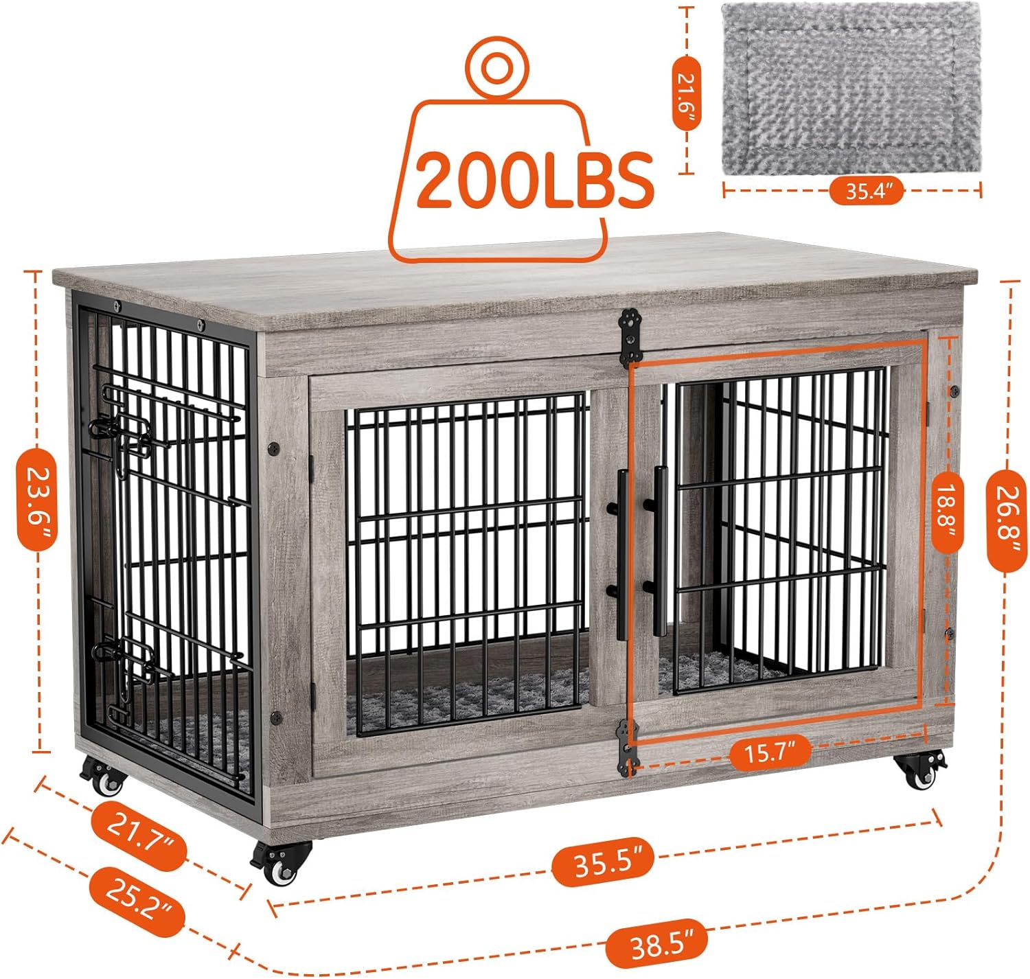 Lulive Dog Crate Furniture Set of 2, Dog Kennel Indoor Double Doors Wooden Dog Cage, 38'' Heavy Duty Dog Crate with Cushion & Wheels, End Table Pet House Chew-Resistant Up to 70 lb, Grey