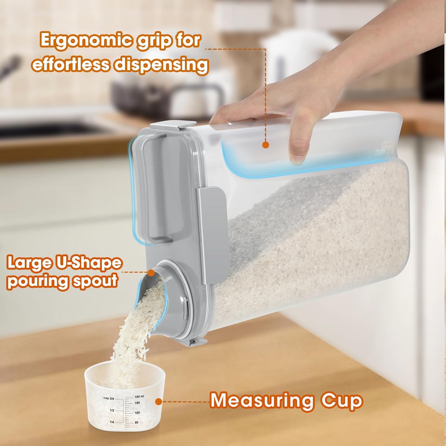 - USER- FRIENDLY RICE CONTAINER: Easy pouring with spout and the ergonomic grip allow to hold the container firmly with one hand. The measuring cup will help you check how much food you get