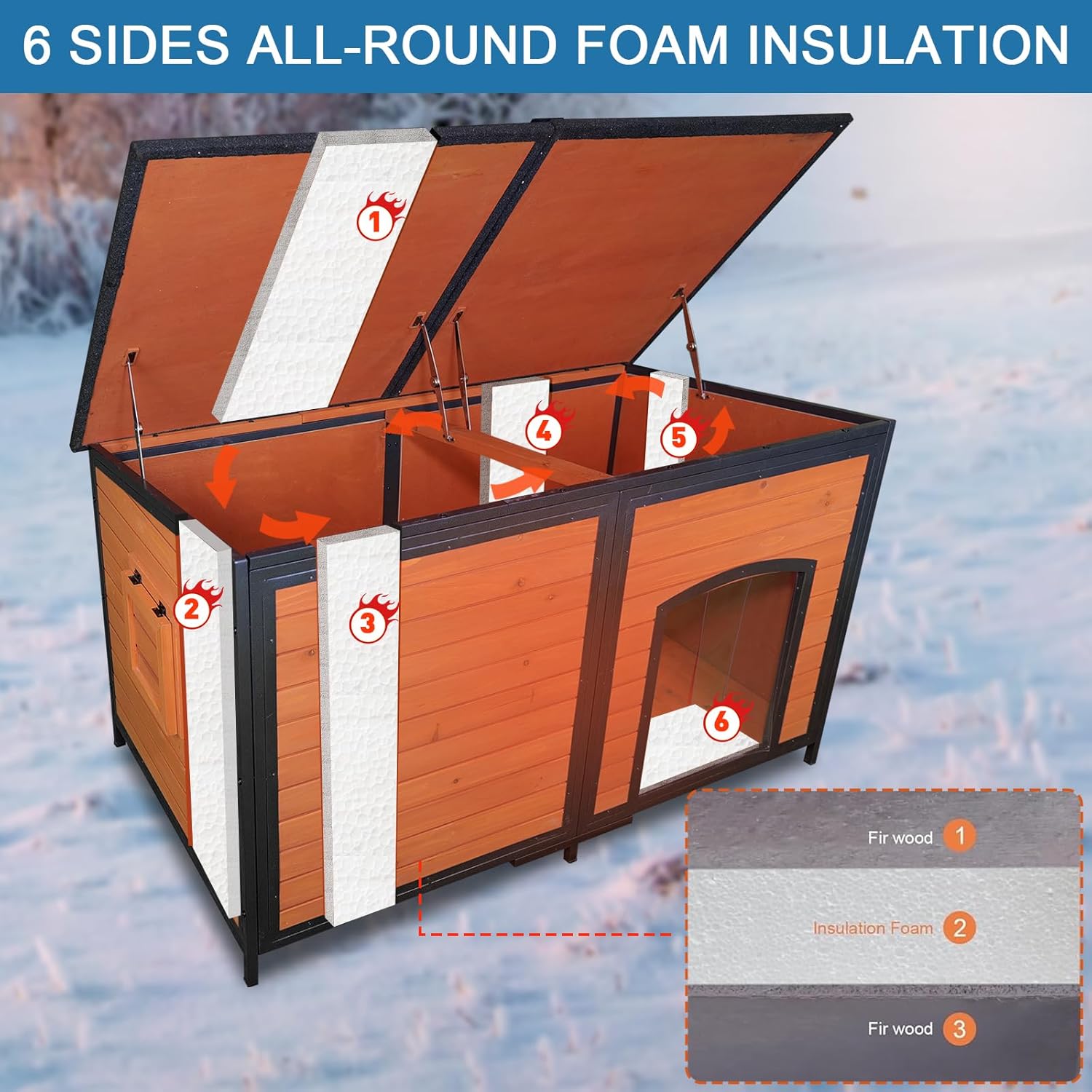 - Insulated Dog House: Built to withstand harsh weather conditions, 6 panels of this outdoor dog house are made of a 0.39-inch thick fir wood, 0.47-inch thick styrofoam interior, and a 0.12-inch thick plywood. No Separate Liners - the foam is permanently sealed within the walls to keep pets warm. The elevated waterproof design and slanted roof ensure your pet stays dry and comfortable