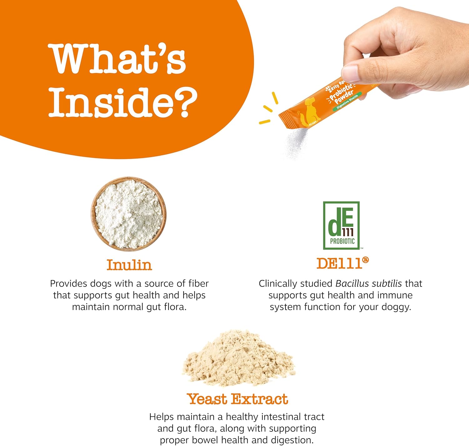 - Tummy Support in a Tasty Powder! - Zesty Paws Probiotic Powder combines a premium probiotic with Inulin (fiber) and Yeast Extract to support digestion and immune function for your pet.
