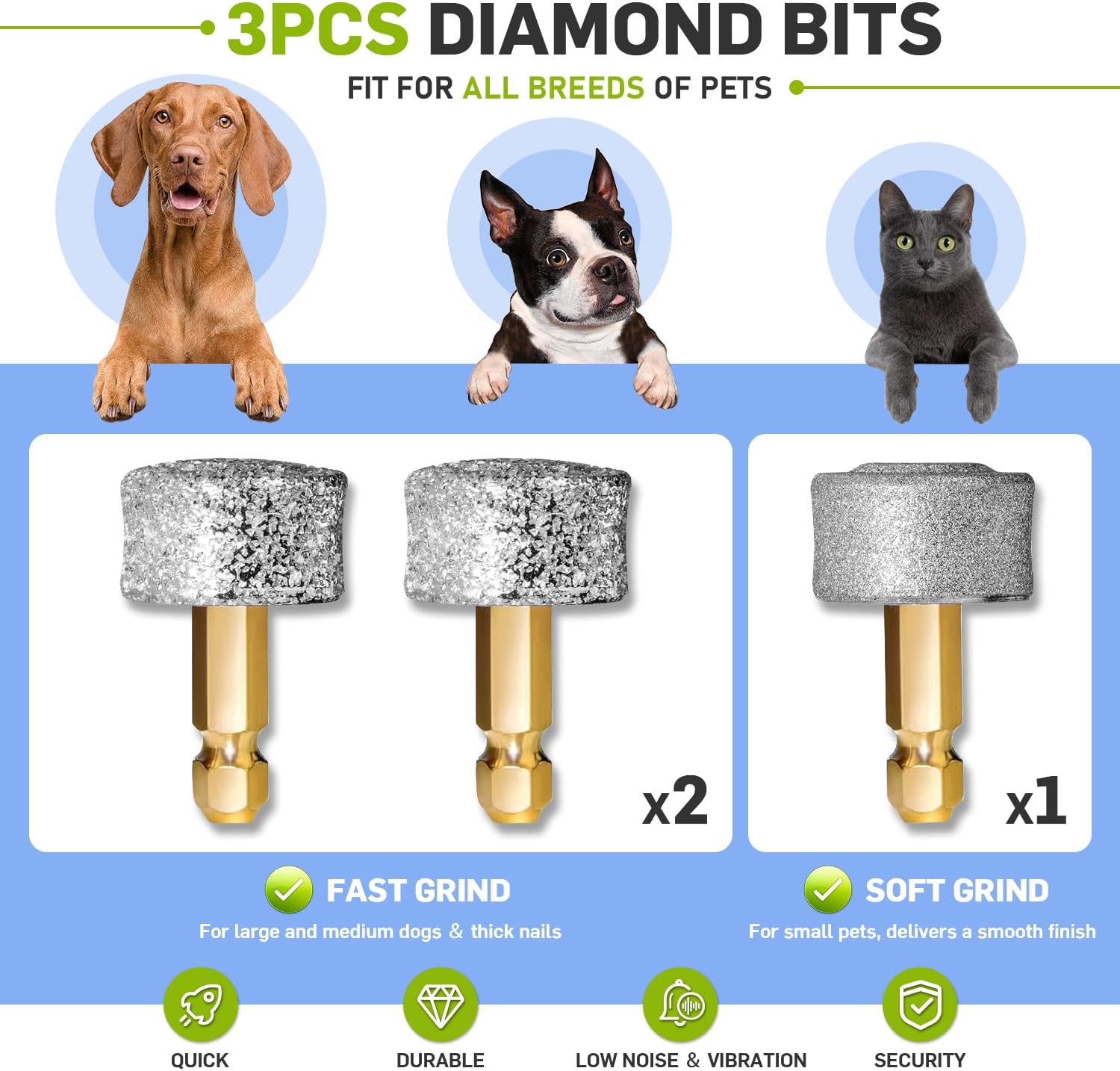 • 🎄🐾【3 Grinding Wheels, 3 Speeds, 3 Ports for All Sizes】Enjoy seamless pet nail care with the professional CADOLS silent dog nail grinder. Boasting a robust 3-speed motor (8000-12000rpm), it effortlessly tackles long and thick nails. Equipped with 3 replacement diamond grinding wheels separately, one super soft, two super hard,plus 3 tailored grinding ports, it caters to large, medium, and small dogs, cats,large breed . This versatile setup offers a comprehensive 360-degree nail grooming experience, ensuring stress-free nail trimming for all your furry friends.