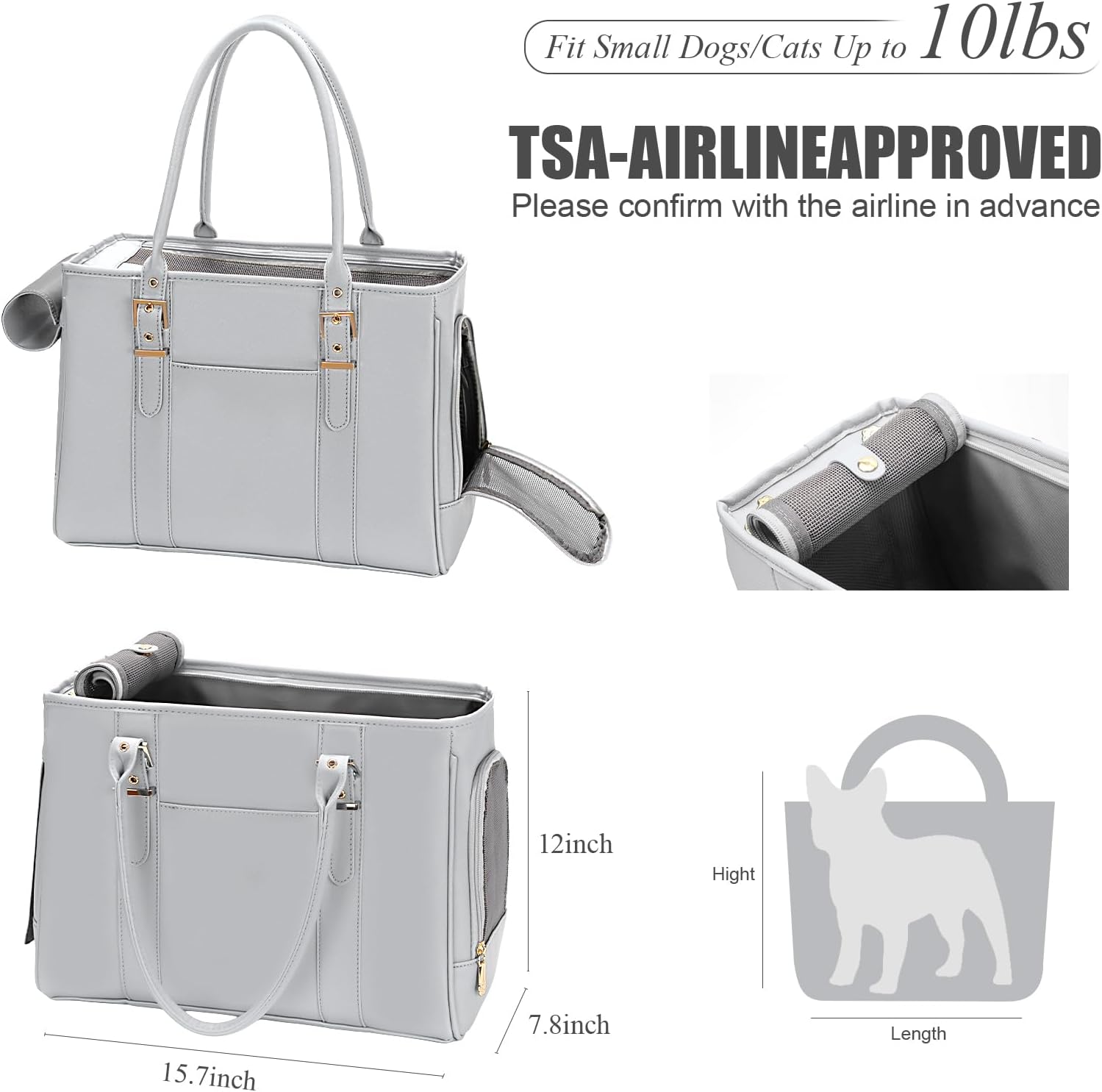 Fashion Pet Carrier Dog Purse Cat Bag Soft-Sided Carriers Travel Airline Approved, Stylish Leather Tote Handbag for Small Animal Puppy Kitten (Grey)