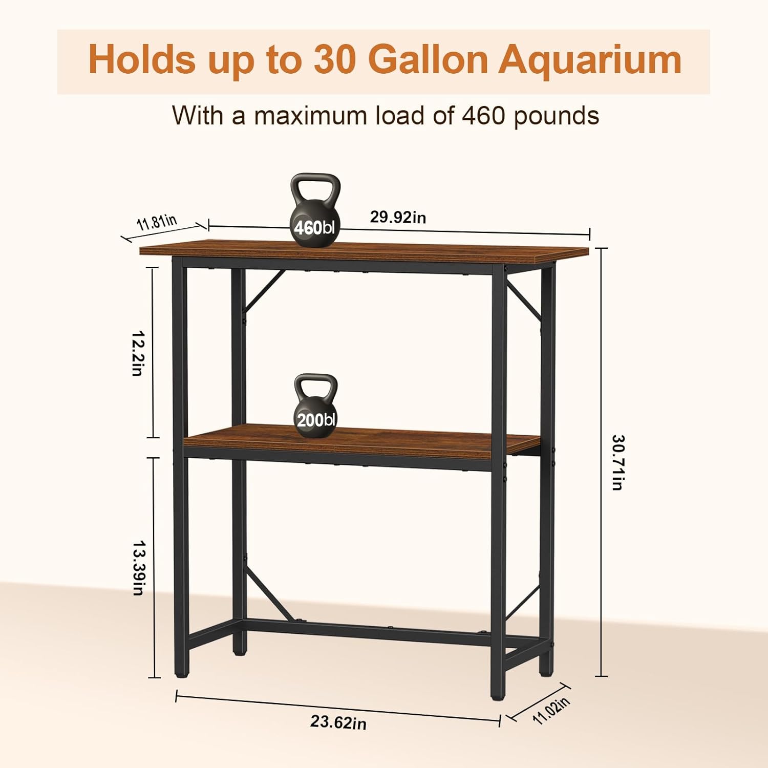 - Product Dimensions: The dimensions of this 30 gallon aquarium stand are 29.92 inches (L) x 11.81 inches (W) x 30.71 inches (H). The top shelf can support up to 460 pounds, making it ideal for a 30-gallon fish tank. The middle shelf offers space for storing fish-keeping essentials and can hold up to 200 pounds. Please check the product dimensions before purchasing to ensure it meets your requirements