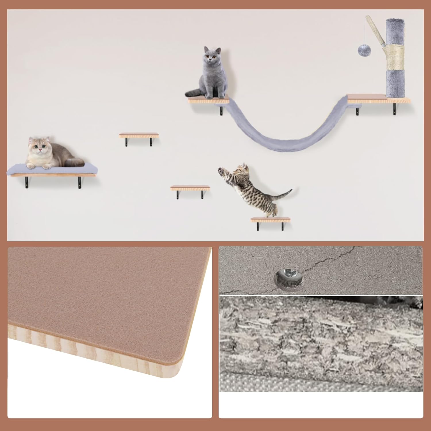 - SPACE SAVING:We designed our cat wall furniture set in a variety of combinations to effectively save floor space and adapt to different installation environments, such as living rooms, bedrooms and balconies. Whether in a compact apartment or a spacious room, you can find the right space for your cat to enjoy maximum freedom of movement
