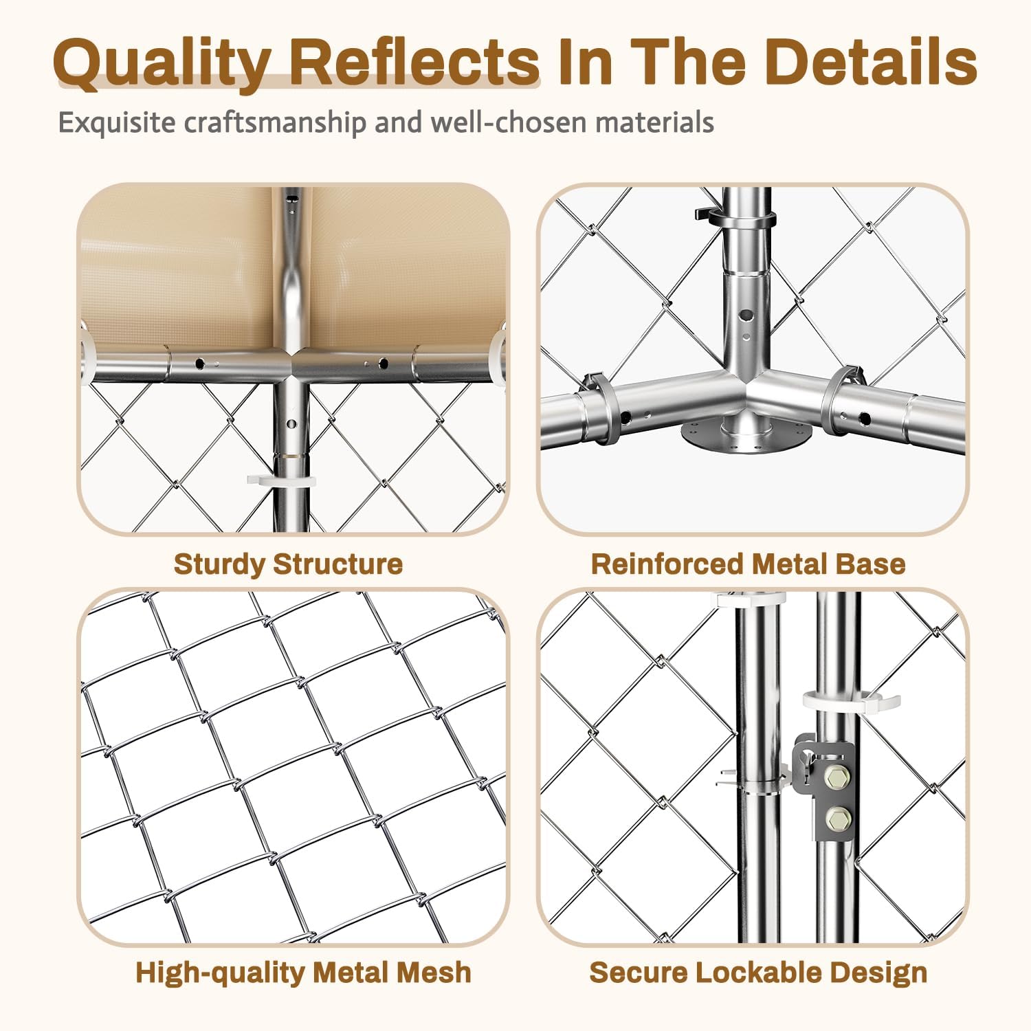 - Full Waterproof Cover:The waterproof cover can cover the entire top of the dog cage.On rainy days, even dogs in cages don't get wet.The plastic tie is used to connect with the fence,which can withstand strong winds