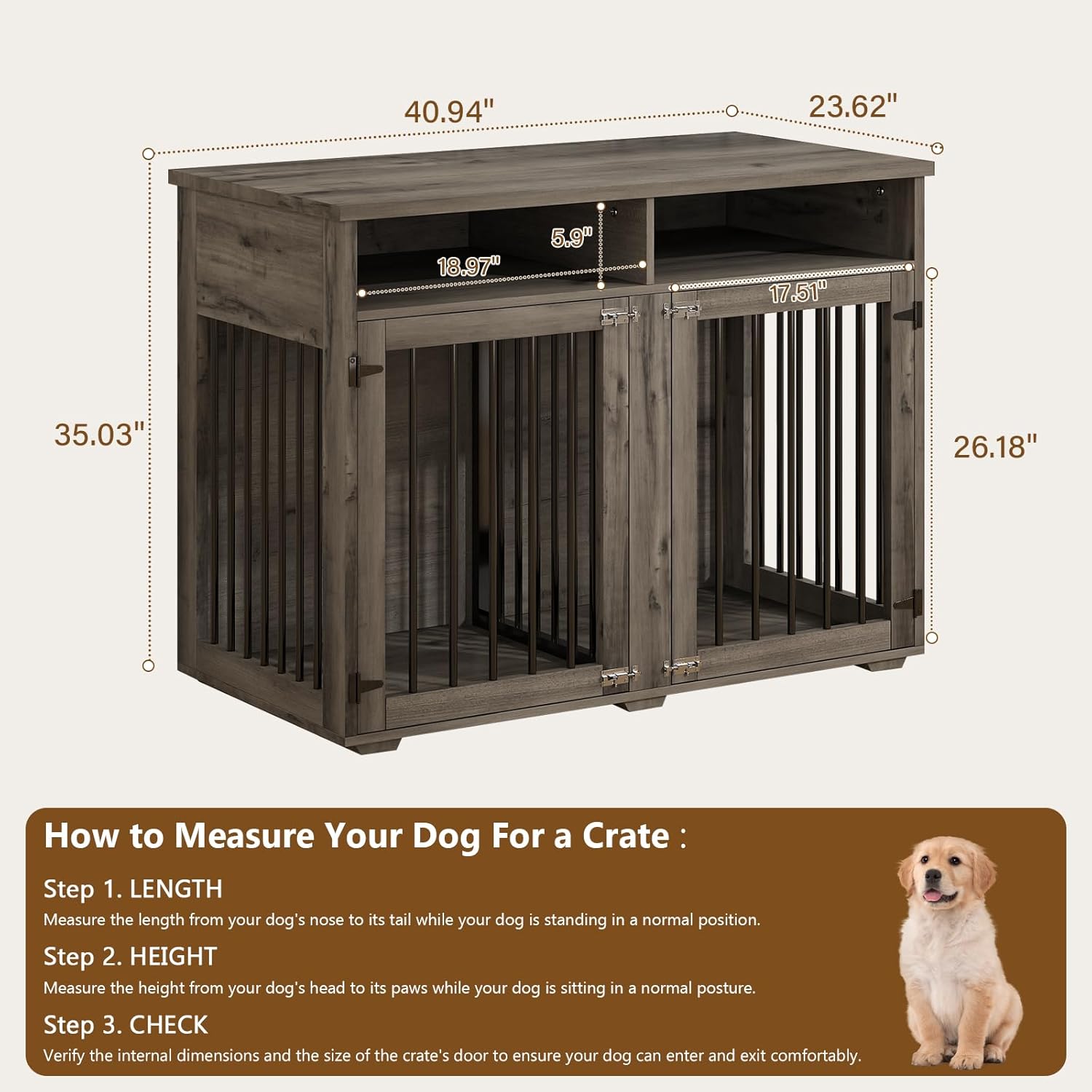 - [Durable Build & Supports Puppy's Growth] Crafted from sturdy wood and heavy-duty steel bars, the dog crates for medium dogs offers lasting strength. Reinforced latches secure your "escape artist"