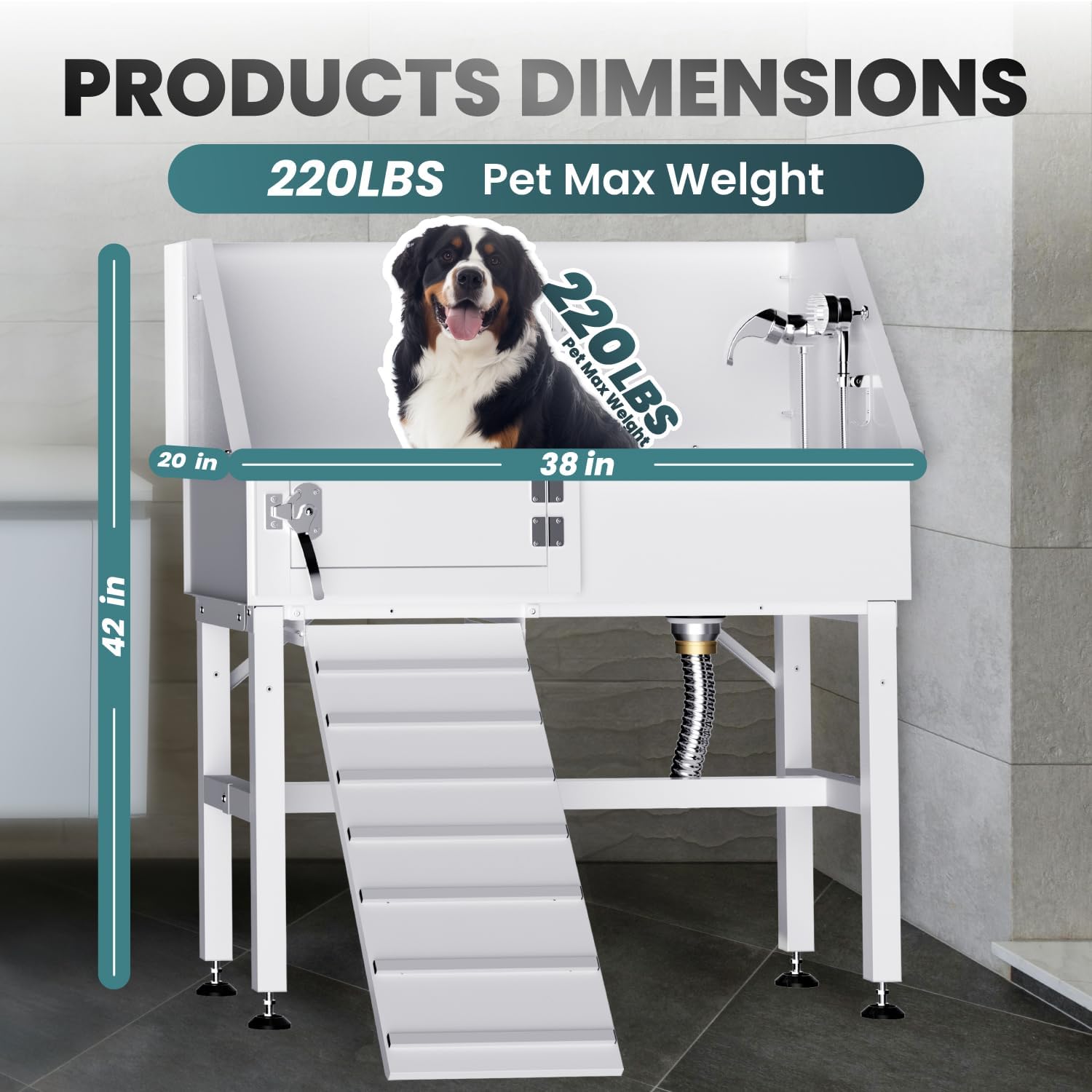 Dog Washing Station for Home, 38" White Professional Stainless Steel Dog Grooming Tub, Height Adjustable Dog Bathing Station, Upgrade Parts, Dog Bath Tubs for Small & Medium Dogs(Left Ramp)