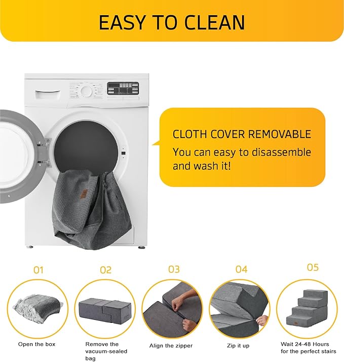 - 【Easy to Clean】: The dog stairs feature a removable, machine washable cover for effortless cleaning. Simply take out the foam core for washing; however, please avoid cleaning the foam and board. After removing from the compression bag, allow 24-48 hours for the foam to fully expand before use for optimal comfort